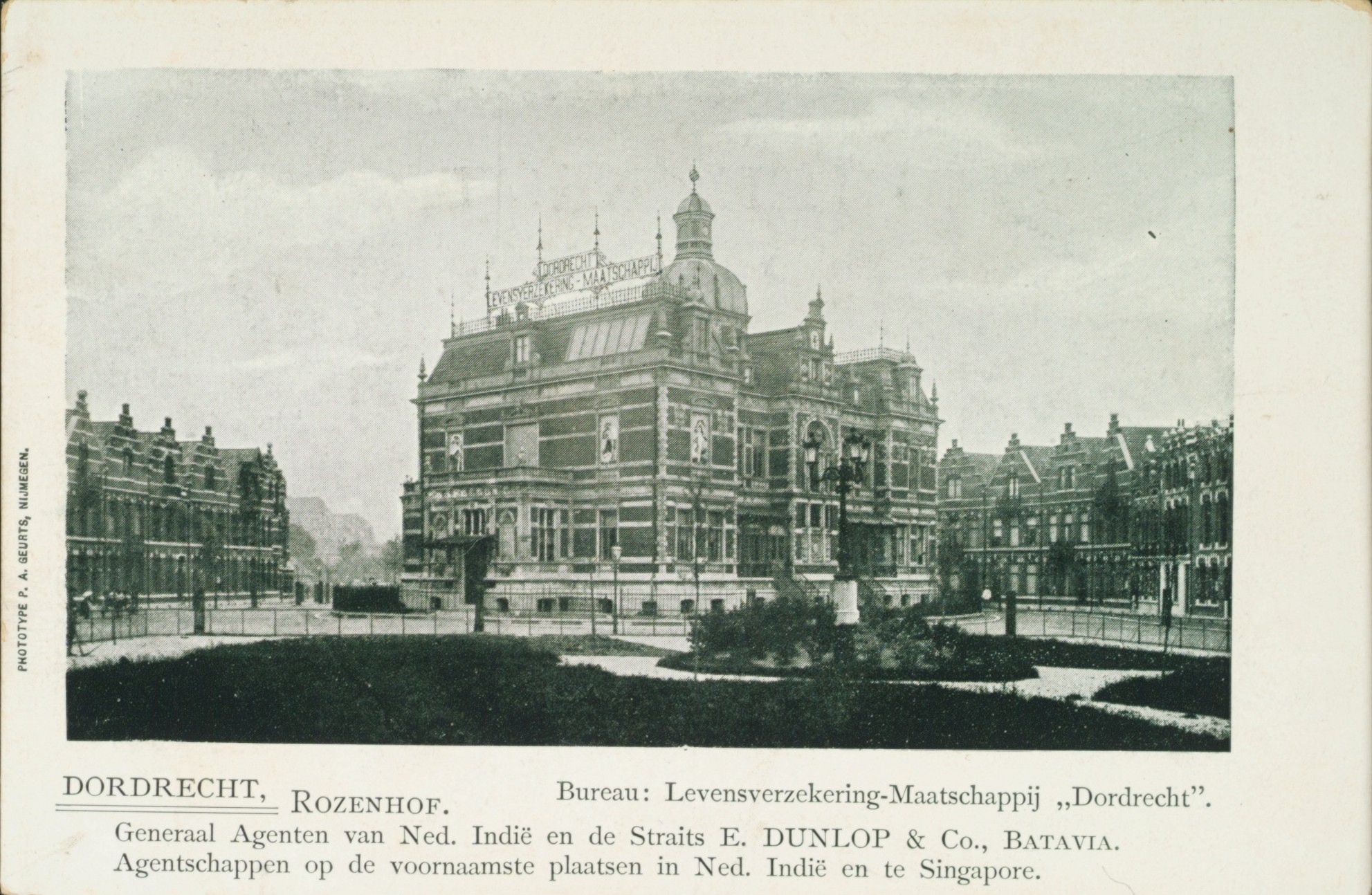 - Kantoor van Levensverzekeringmaatschappij Dordrecht in villa Rozenhof in de Rozenhof, gezien vanaf de Havenstraat. Links de Maatschappij Dordrechtstraat, rechts de Levensverzekeringstraat.