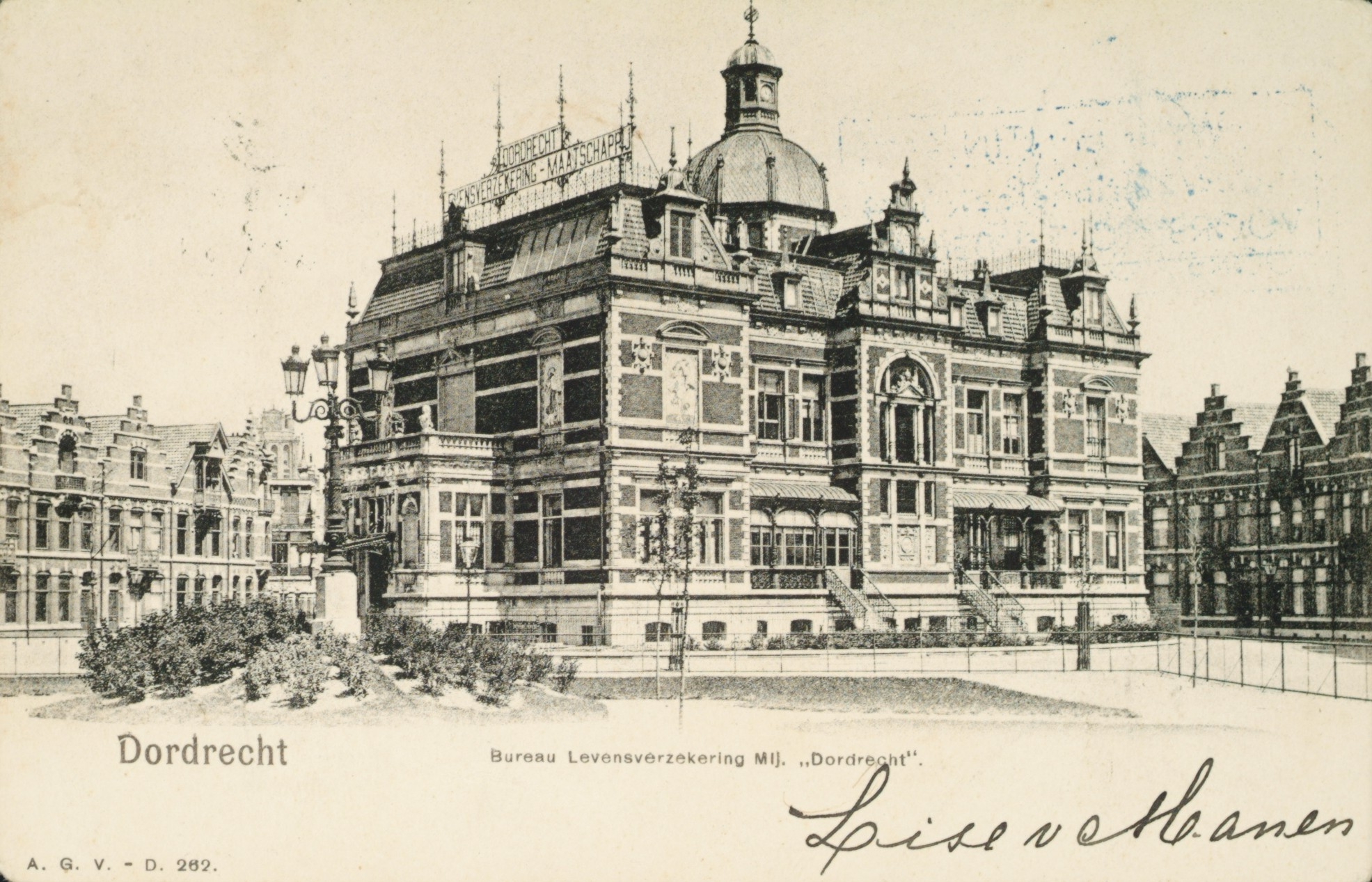 - Kantoor van Levensverzekeringmaatschappij Dordrecht in villa Rozenhof in de Rozenhof, gezien vanaf de Havenstraat. Links de Maatschappij Dordrechtstraat, rechts de Levensverzekeringstraat.