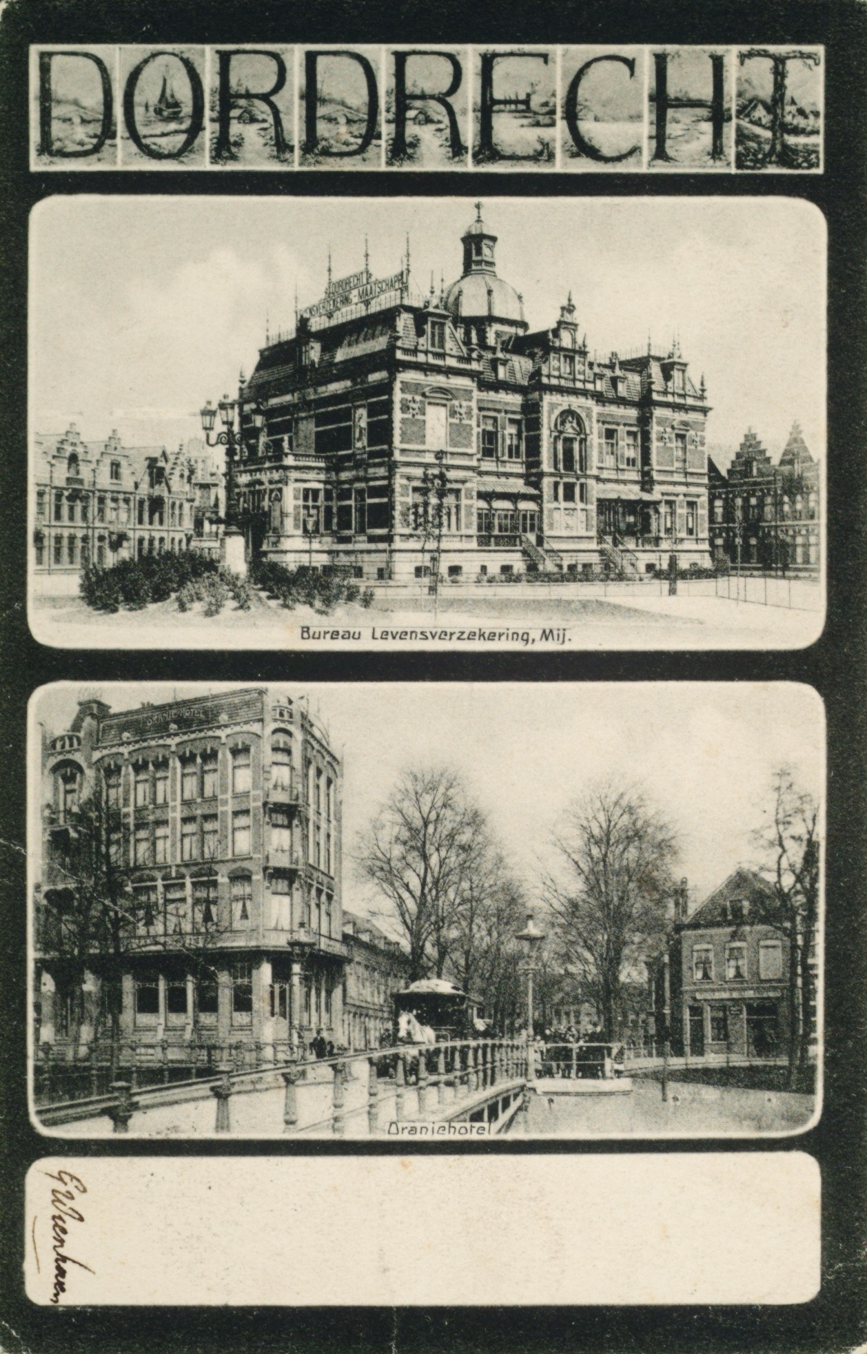 - Boven: Kantoor van Levensverzekeringmaatschappij Dordrecht in villa Rozenhof in de Rozenhof, gezien vanaf de Havenstraat. Links de Maatschappij Dordrechtstraat, rechts de Levensverzekeringstraat. Onder: Het Oranjehotel op de hoek van de Vest en de Johan de Wittstraat. De paardentram komt over de Johan de Wittbrug, het Bagijnhof op de achtergrond.
