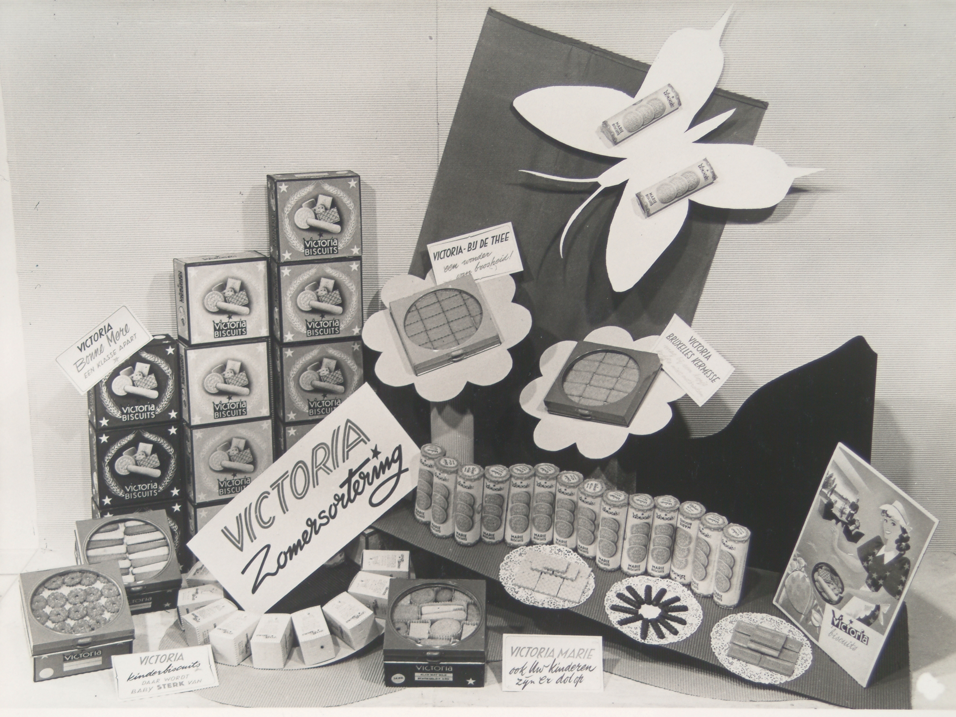 Reclame voor producten van de Chocolade- en biscuitfabriek Victoria aan de Korte …