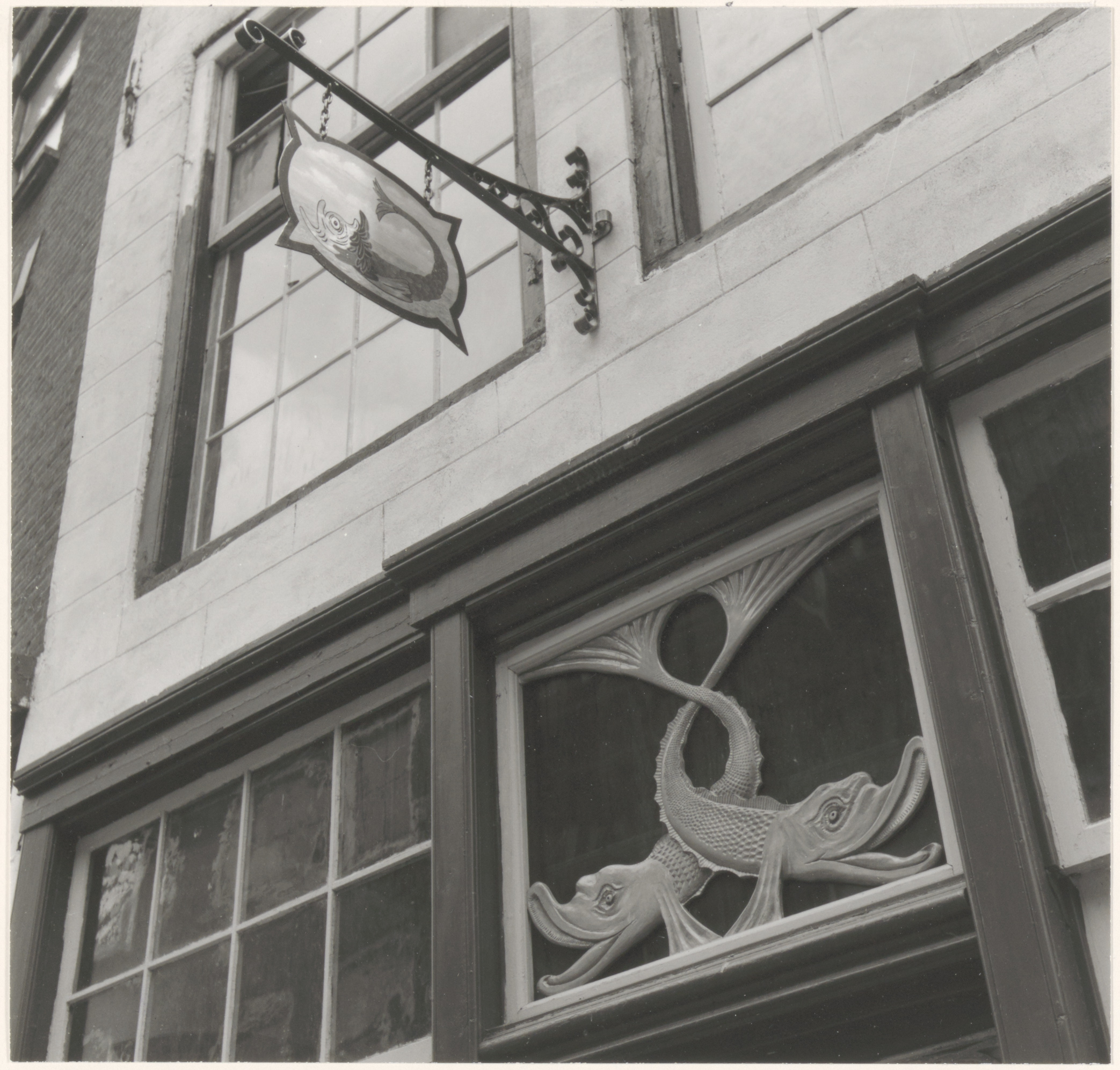 - Gevel van het huis Voorstraat 8, tegenover het Melkpoortje, met bovenlicht met 2 inééngestrengelde vissen en uithangbord met een enkele vis.