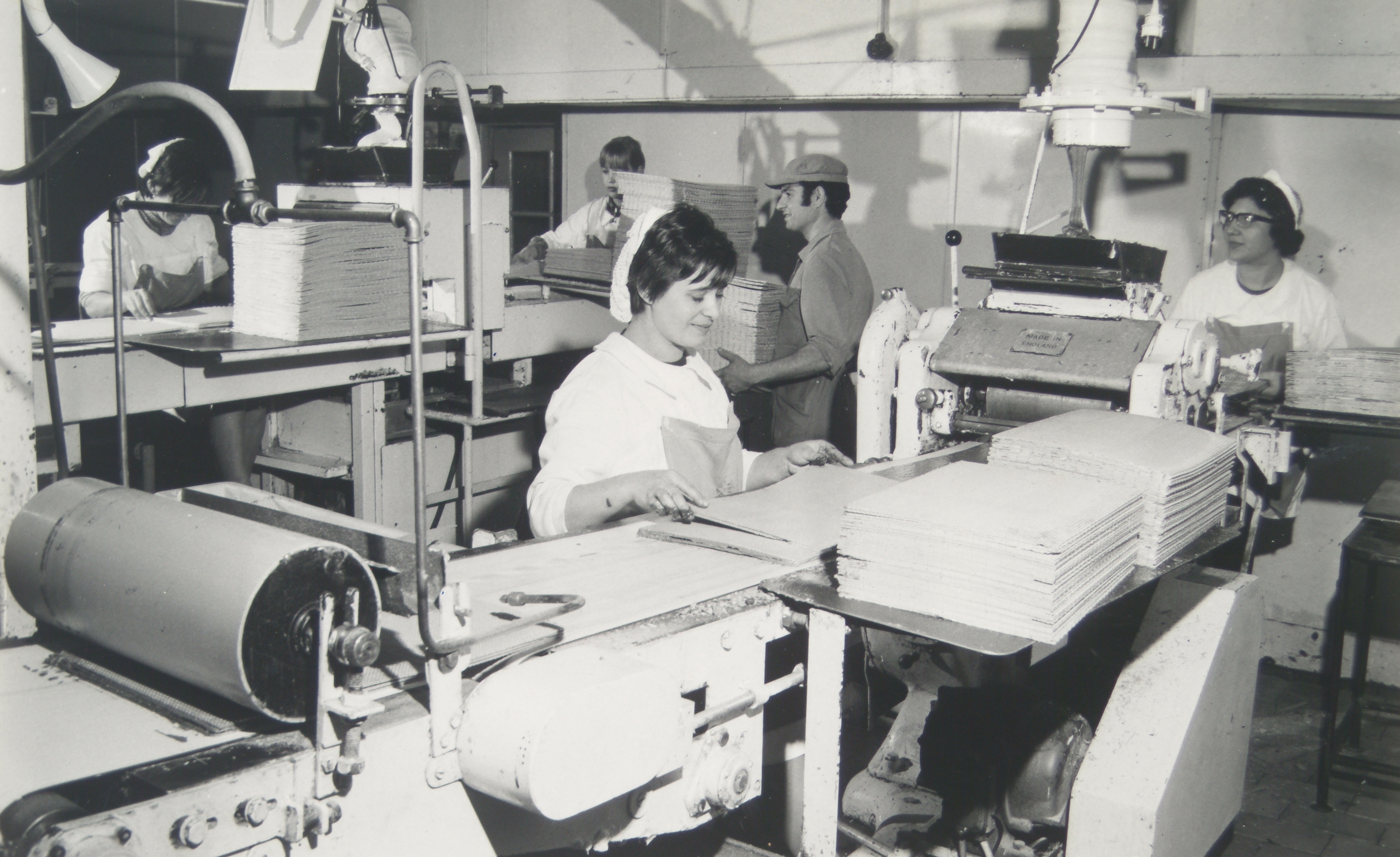 Het maken van dozen in de Chocolade- en biscuitfabriek Victoria aan de Korte Parallelweg