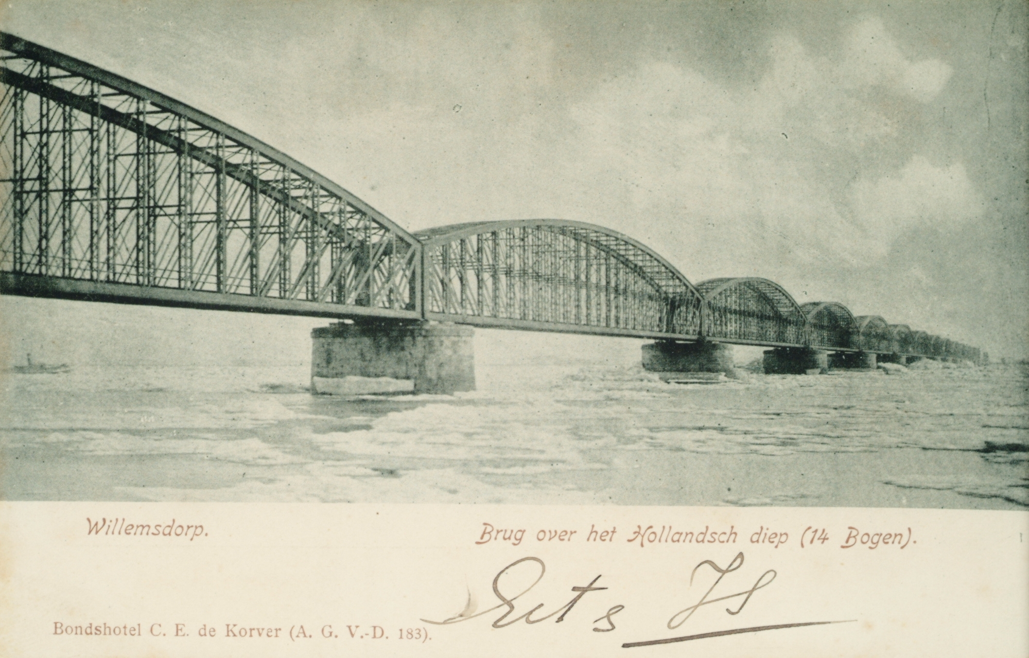 - De kaart is een co-uitgave van Bondshotel C.E. de Korver op Willemsdorp, waar Prins Hendrik regelmatig te gast was. De eerste Moerdijkbrug werd geopend op 1 januari 1872. De enkelsporige vakwerkbrug bestond uit veertien boogvormige overspanningen van elk ruim honderd meter, die aan de oever waren gebouwd en vervolgens naar hun plaats werden gevaren. De brugdelen werden geconstrueerd door de Koninklijke Van Vlissingen & Dudok van Heel. (bron Wikipedia)