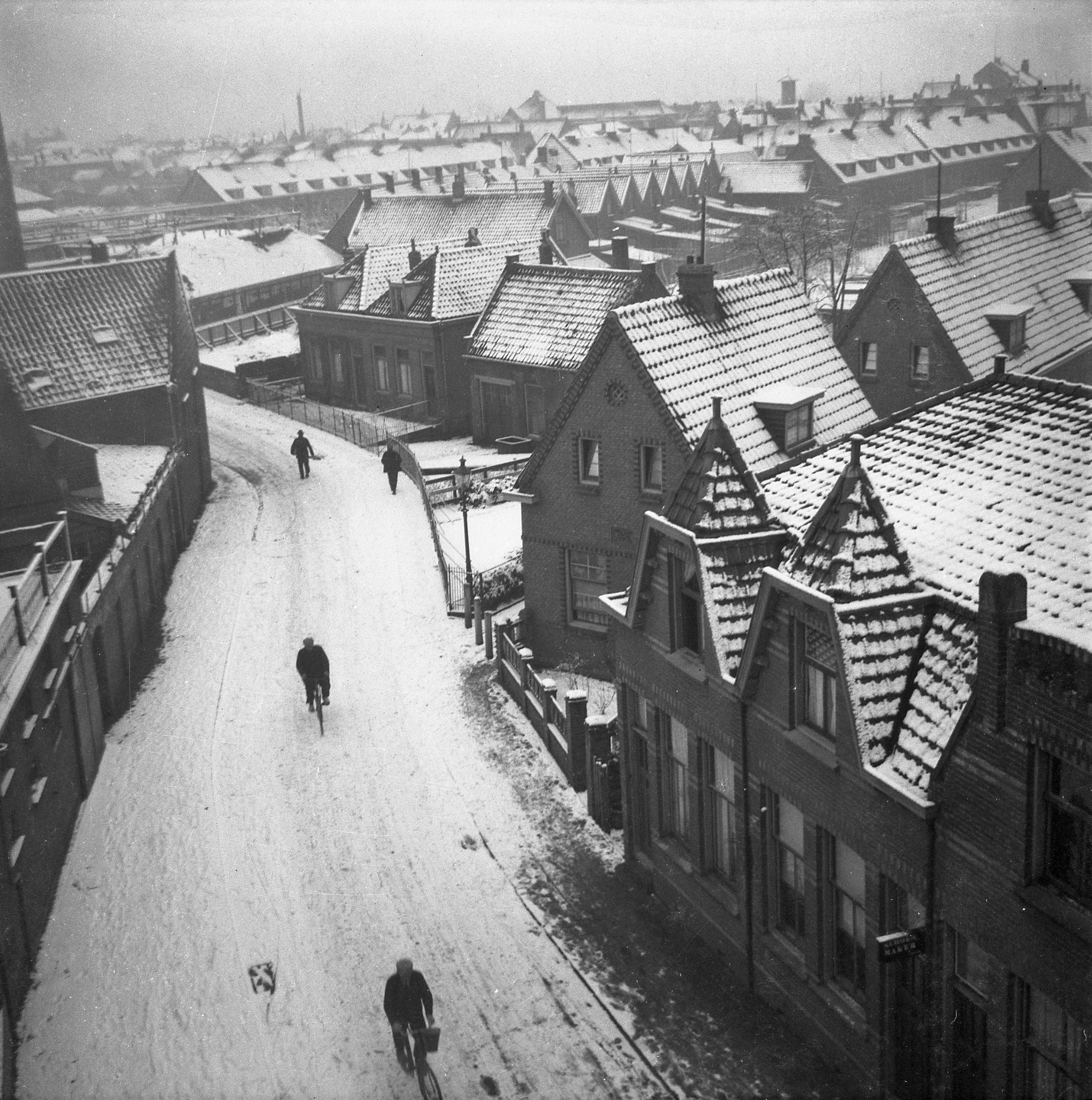 Gemaakt vanuit het bovenhuis van Foto Elegant aan de Ringdijk. De eerste straat rechts (linksboven) is de Molenstraat. Het wandelpaadje rechtsvoor bij de paaltjes zigzagt naar het Oranjeplein rechtsachter.