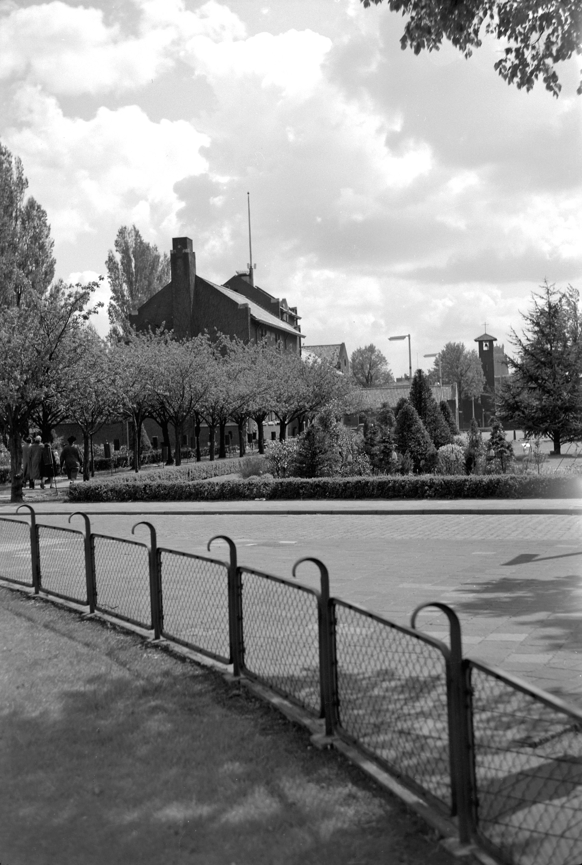 Links het gemeentehuis en rechts de toren van de H.Hartkerk aan de Bruïnelaan in Zwijndrecht.