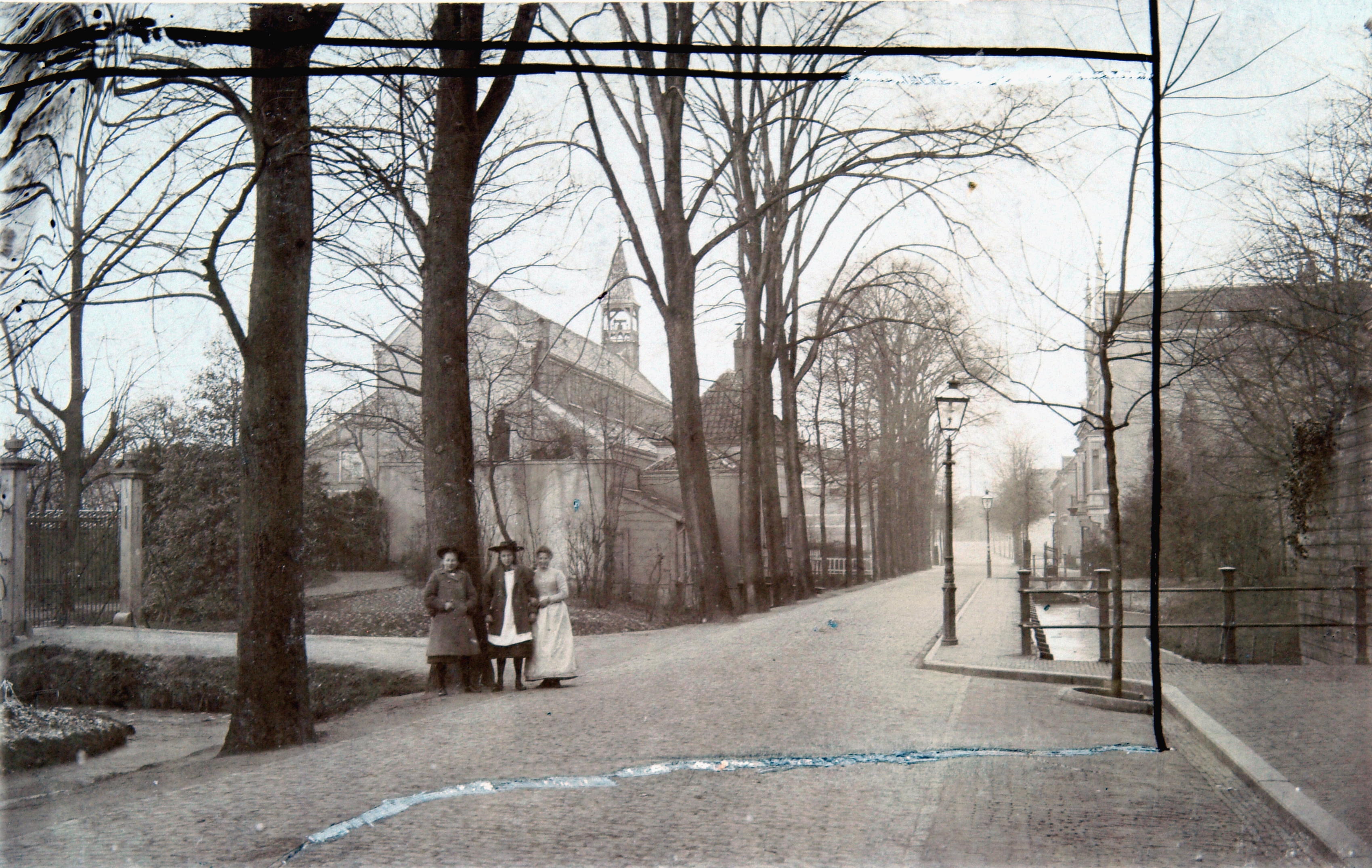 De Van Strijsingel gezien vanaf de Spuiweg richting de Hoogt. De R.K. kerk stond op de plek tussen Aert de Gelderstraat en Koninginnestraat.