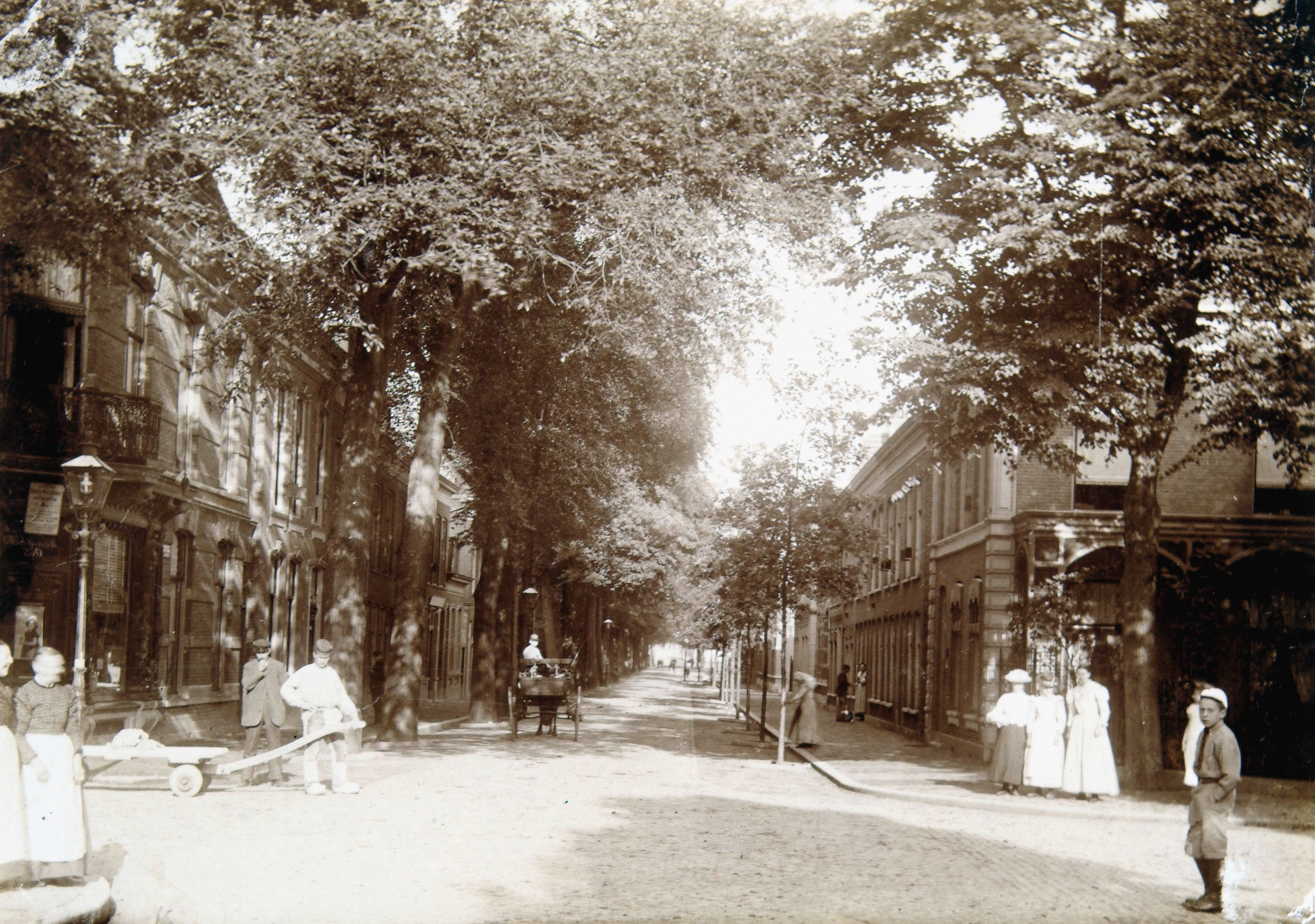 - De Van Strijsingel gezien vanaf de kruising Spuiweg in de richting van de Hoogt. Links op de hoek was bakkerij Scheepers gevestigd.