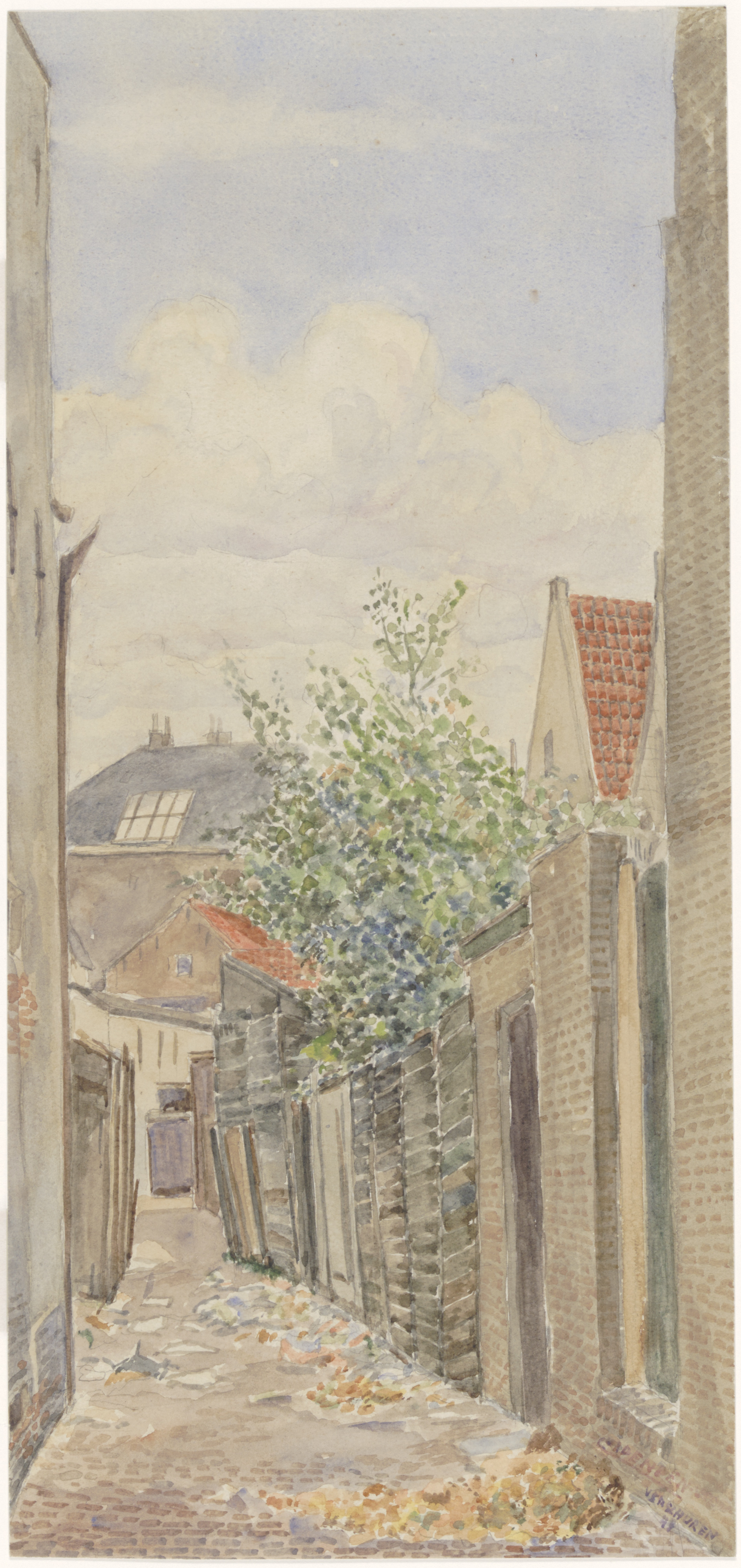 - Gezicht in de gedempte gracht achter de huizen aan de noordzijde van de Heer Heymansuysstraat, gezien in de richting van de Veststraat.