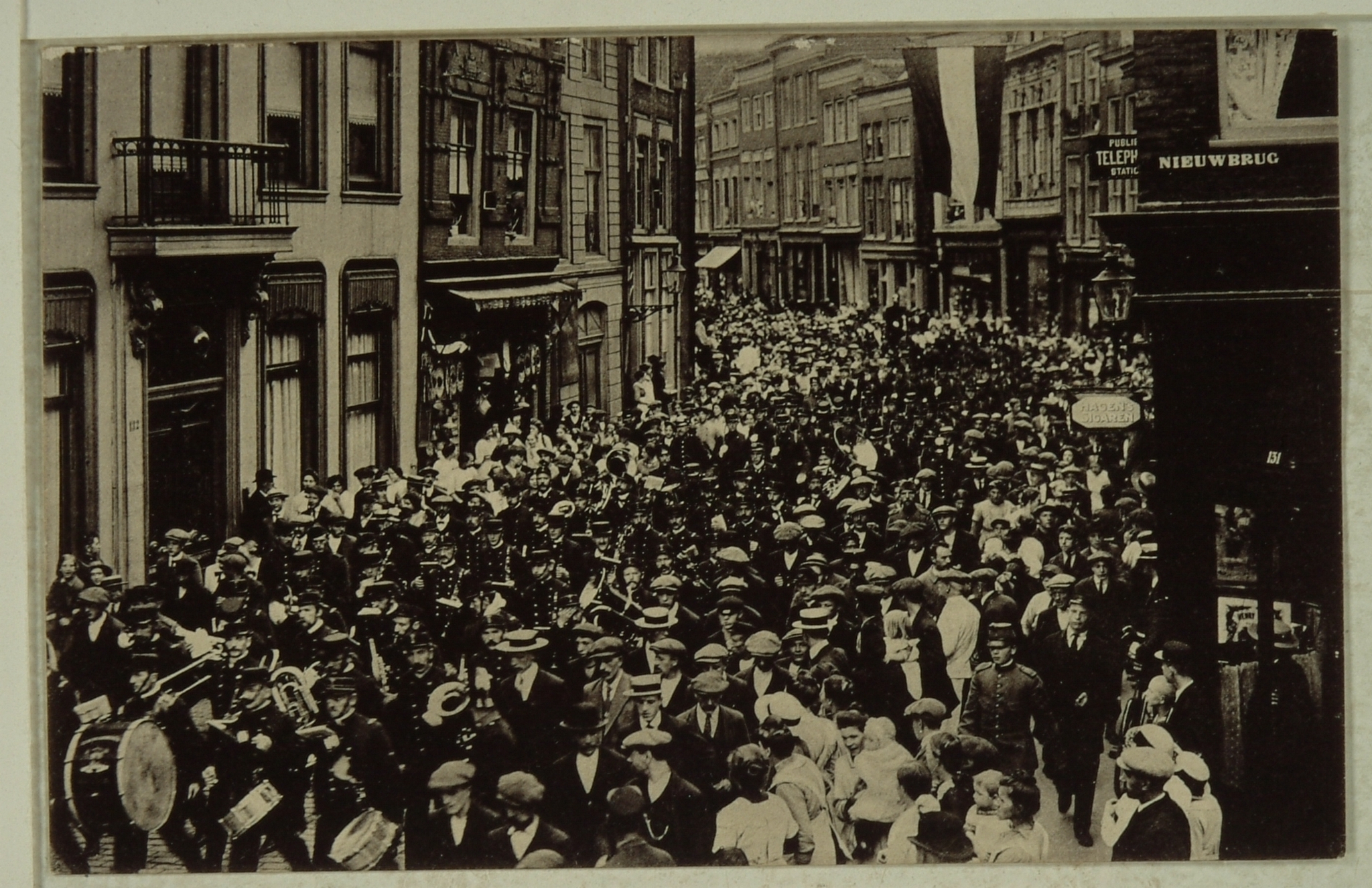 Rechts op de hoek met de Nieuwbrug, P. de Roo winkelier in sigaren (Naamlooze Vennootschap Koninklijke Nederlandsche Utrechtsche Sigarenfabriek H. G. en M. A. Hagen, Voorstraat 131. Telefoon 885.). Je kon er ook telefoneren. Zie ook 555_31345