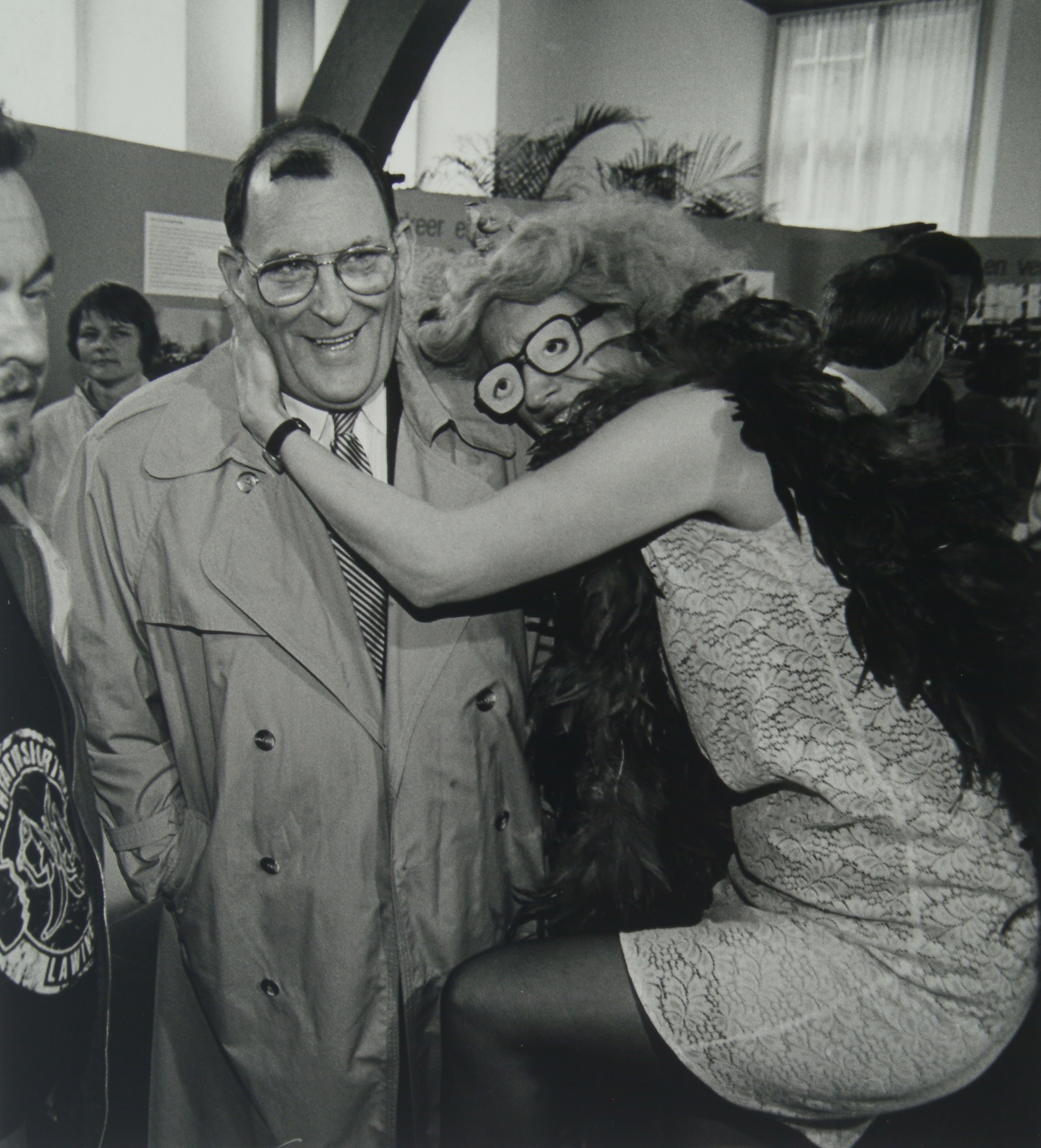 Burgemeester Noorland omhelsd door een bebrilde dame op de derde Dag van Dordt