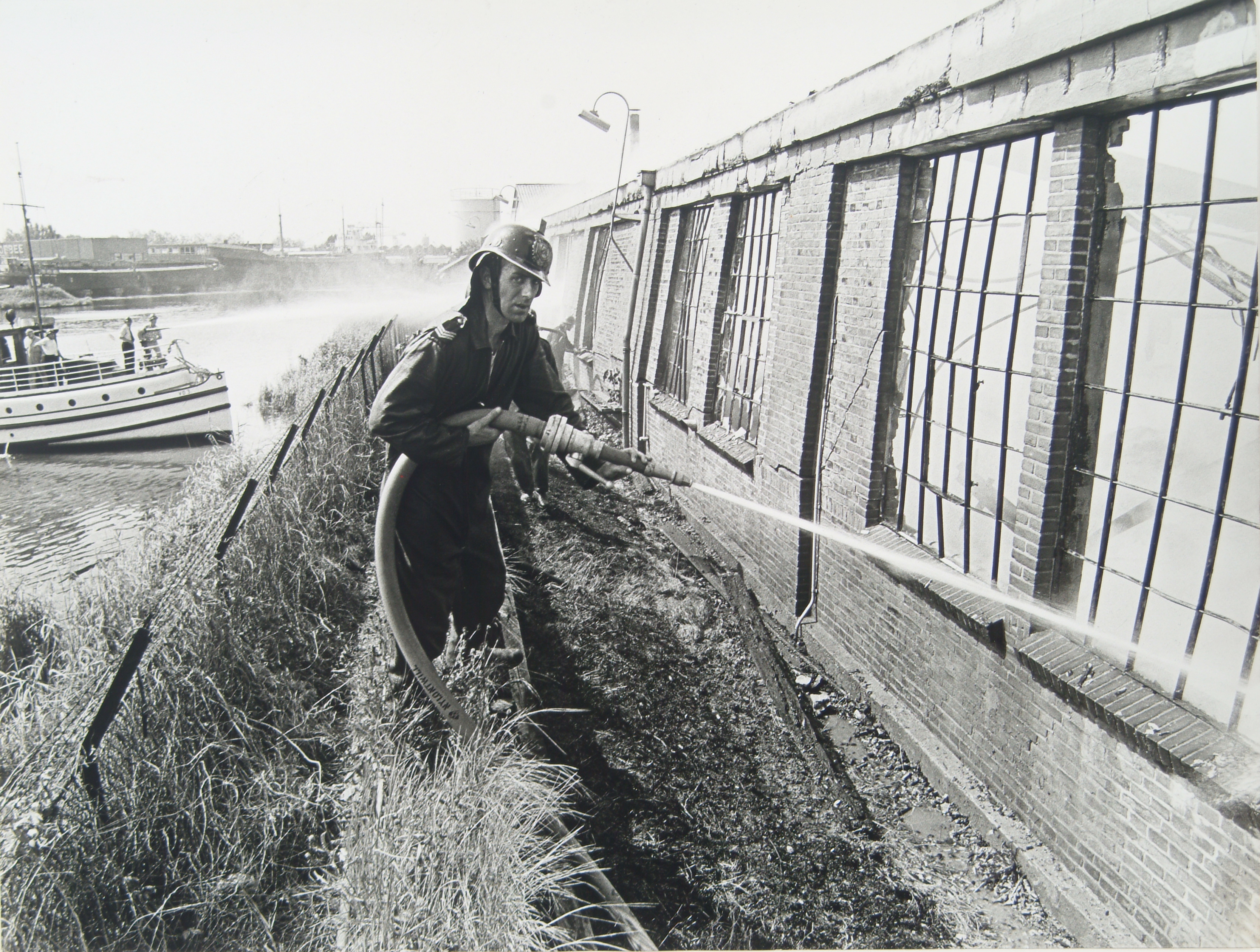 - Brandblusboot Veerdienst III en brandweerman Jan Overgoor blussen een brand in de machinefabriek Johan de Witt aan de Kerkeplaat.