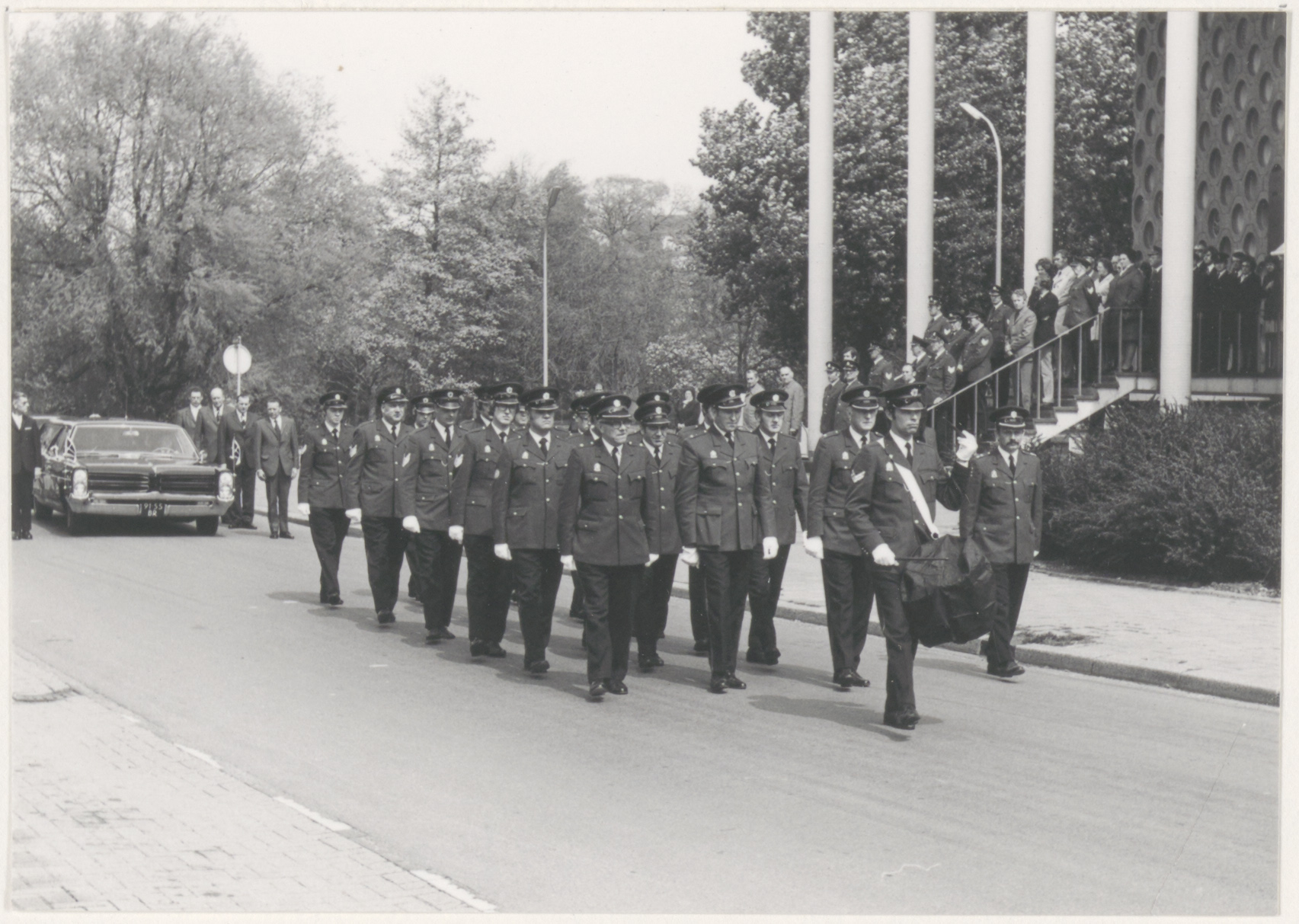 Politiemensen, voorafgegaan door een trommelslager met omfloerste trom, passeren het politieburo aan de Nassauweg in de begrafenisstoet van de plotseling overleden rechercheur H. Norbart.