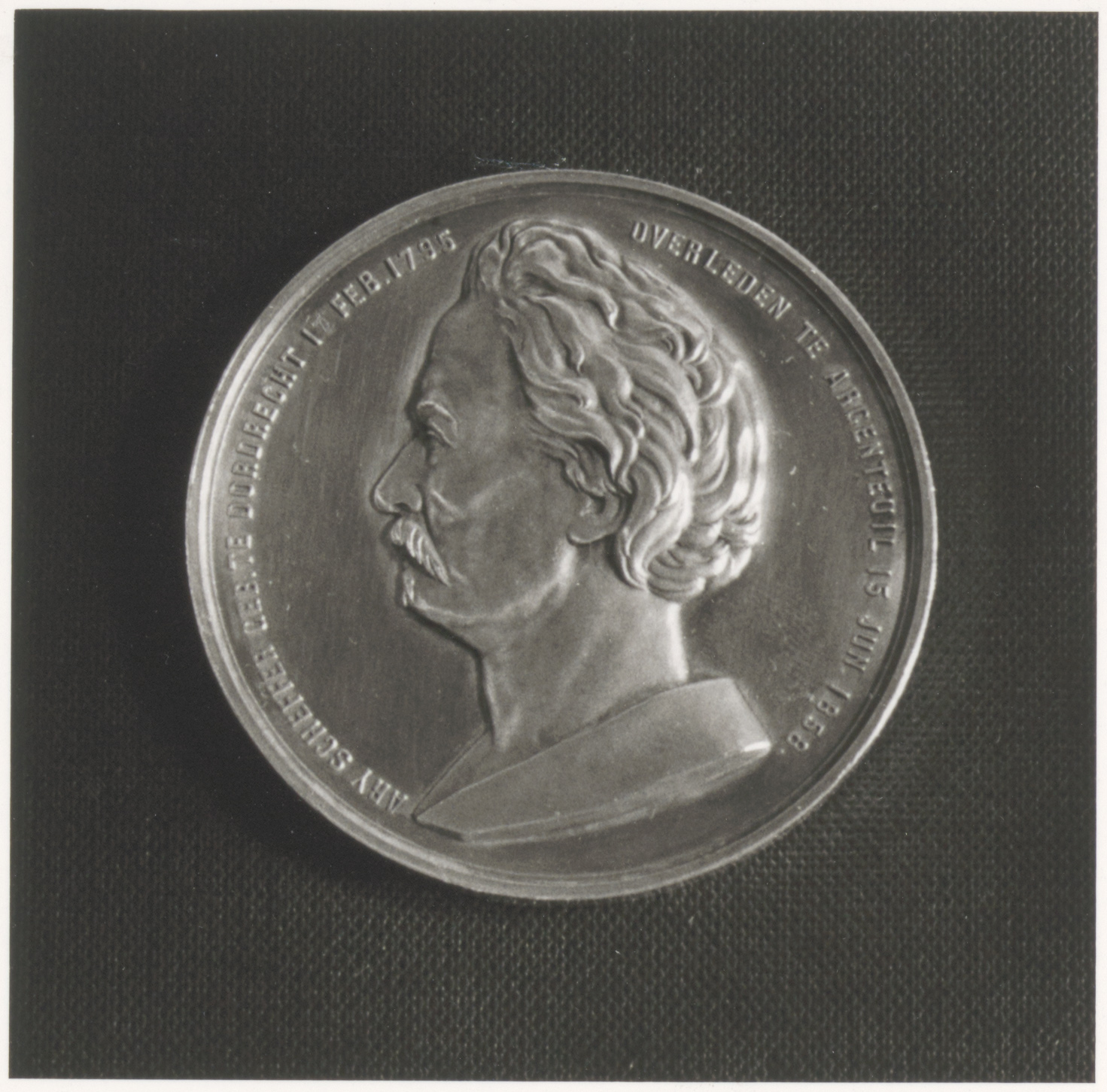 - Voorzijde van een zilveren penning, t.g.v. de onthulling van het standbeeld van Ary Scheffer op het Scheffersplein vervaardigd door J. Ph. van der Kellen, met aan de ene kant de kop van Scheffer en aan de andere kant het standbeeld. Exemplaren van deze penning werden uitgereikt aan hervormd predikant dr. W.R. Veder van de standbeeldcommissie en aan de makers van de Scheffer-cantate Ferdinand Böhme en S.J. van den Bergh. De penning bevindt zich in de Collectie Scheffer van het Dordrechts Museum onder nr. 238.