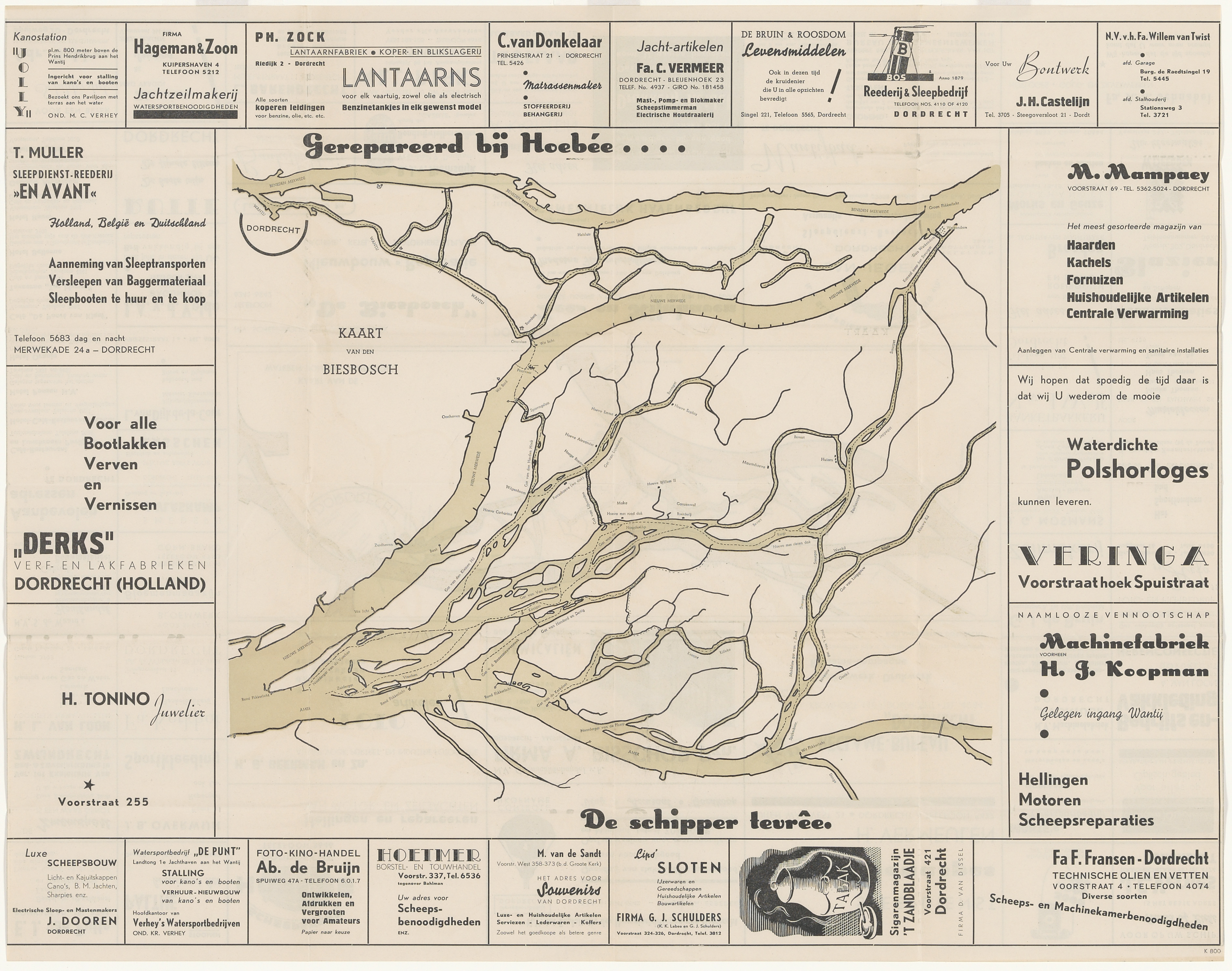 - Kaart van de waterlopen in de Brabantse Biesbosch met randreclame.