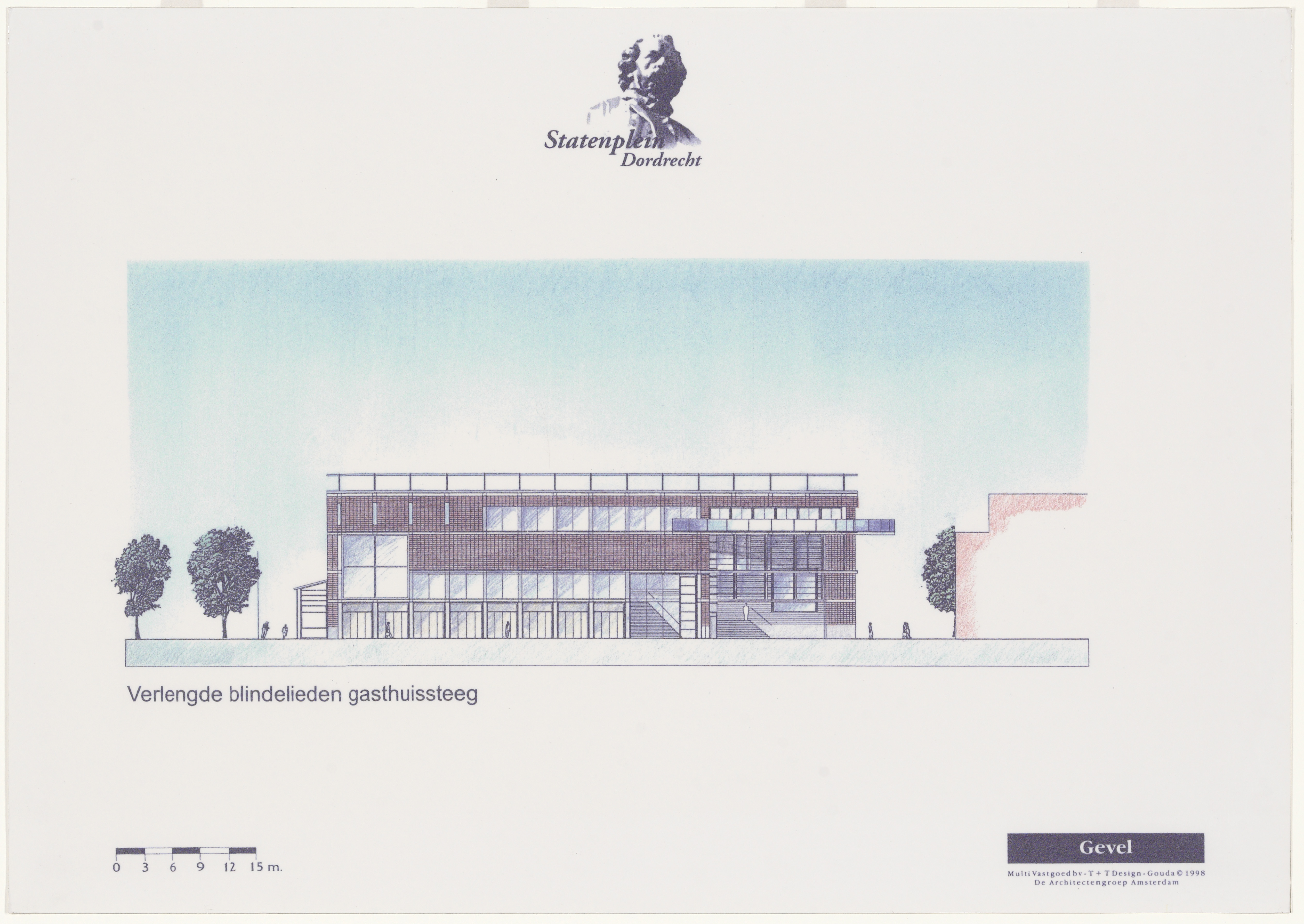 - Aanzicht van het winkelblok van V & D op het Statenplein, gezien vanuit de Blindeliedengasthuissteeg.