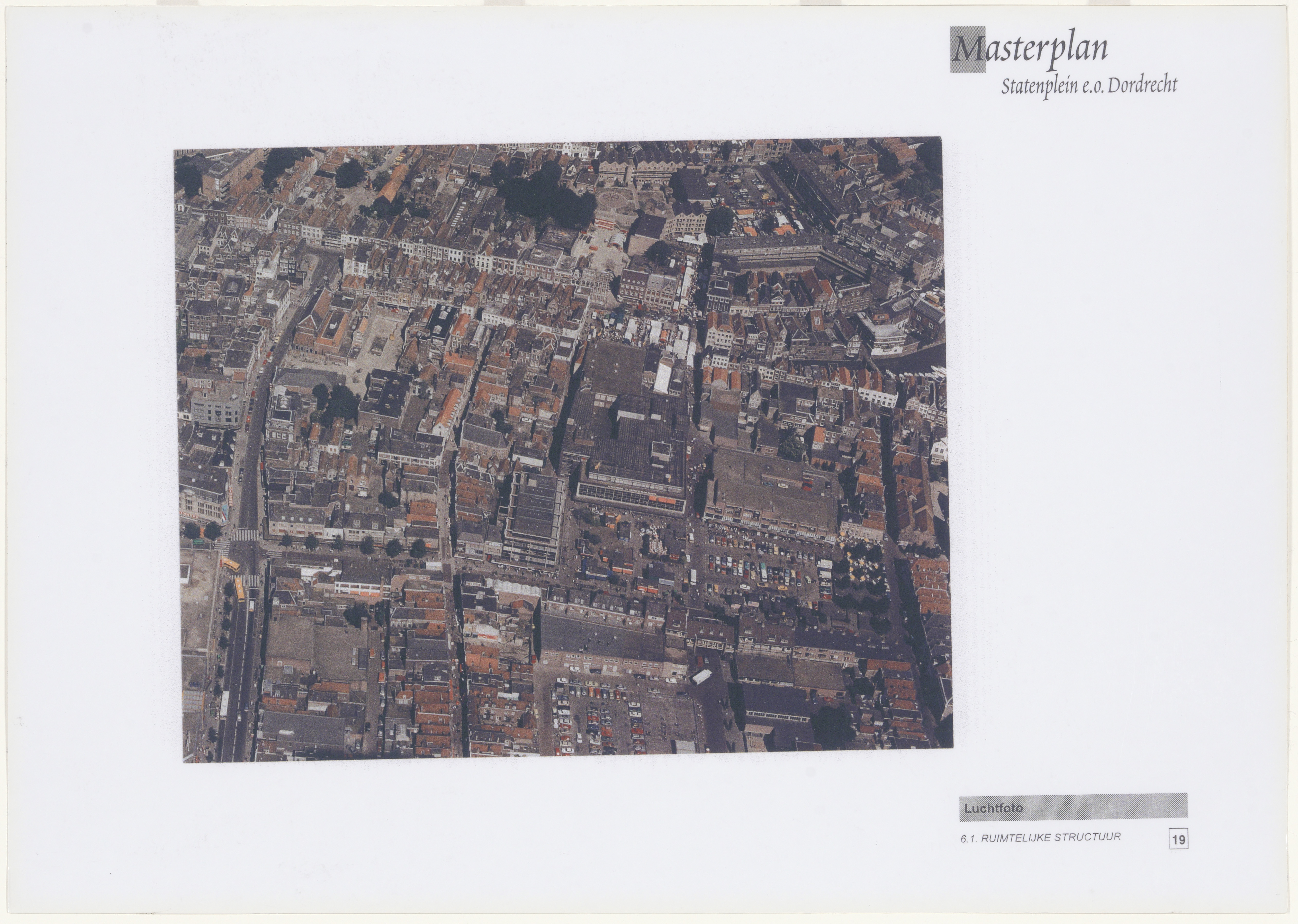 - Luchtfoto van het Statenplein en omgeving: l.b. rk-ziekenhuis Houttuinen, r.b. Schrijversstraat, r.o. Korte Nieuwstraat en l.o. Bagijnhof.