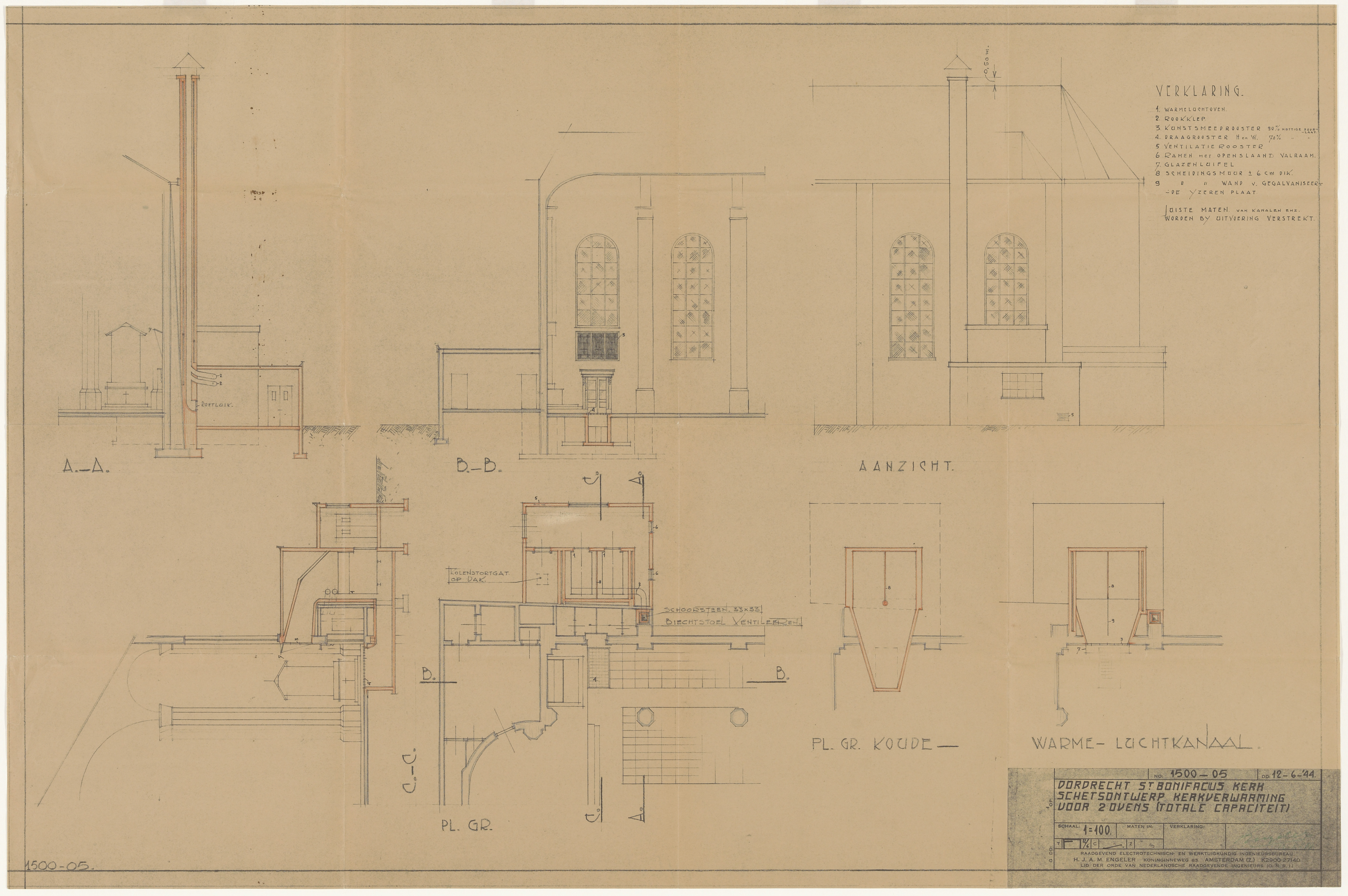 Bouwtekening van de rk Bonifatiuskerk aan de Wijnstraat t.b.v. de aanleg van verwarming.