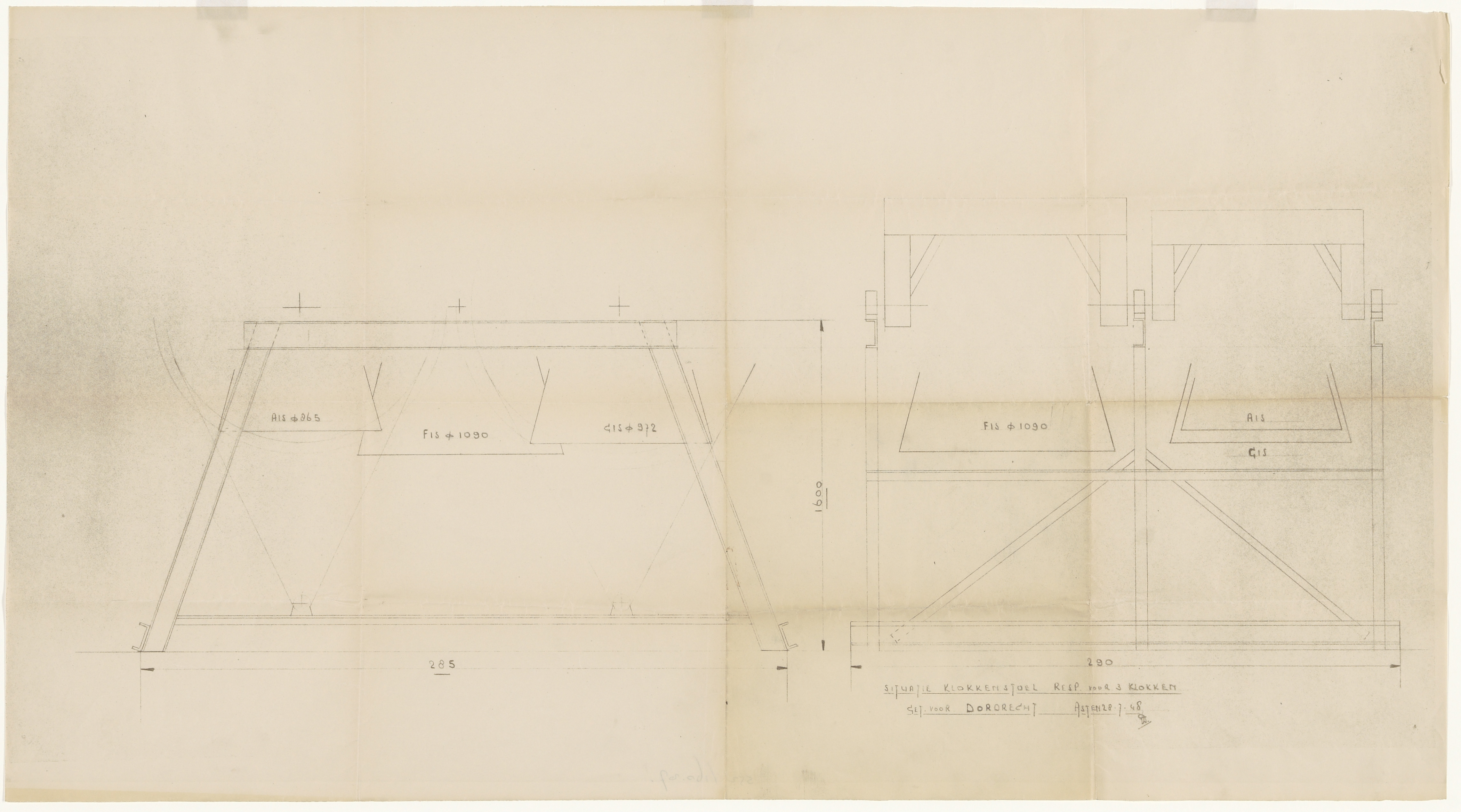 - Bouwtekening van de klokkenstoelen in de rk Bonifatiuskerk in de Wijnstraat.