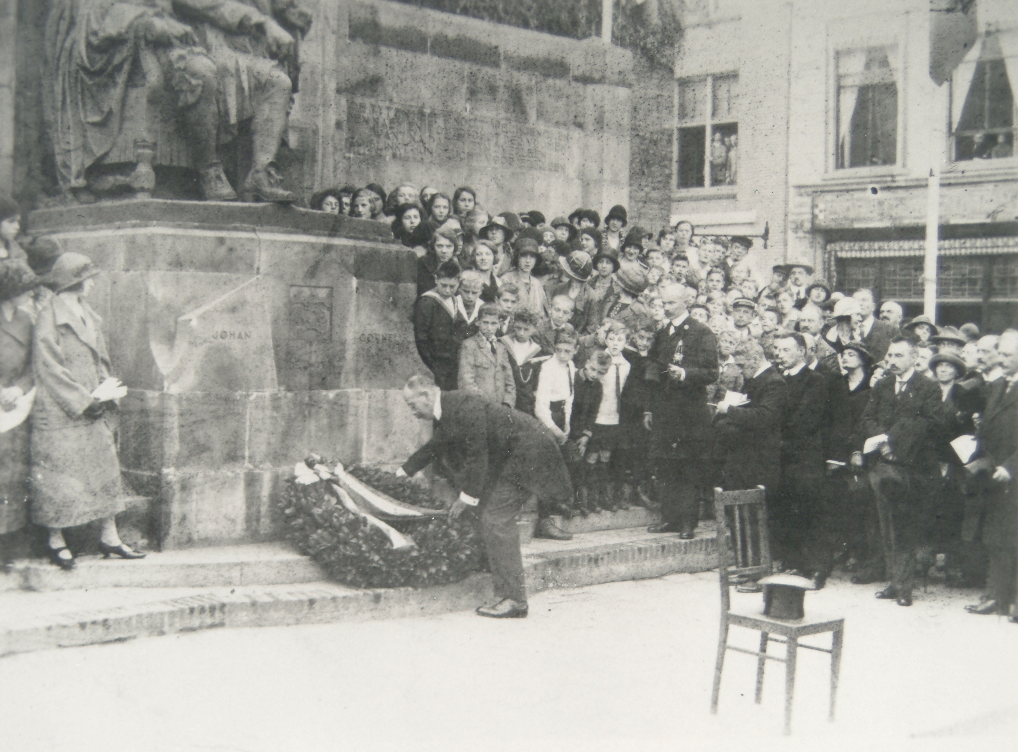 - Kranslegging door burgemeester P. de Gaay Fortman bij het standbeeld van de gebroeders De Witt op de Visbrug bij de herdenking van de 300e geboortedag van Johan de Witt.