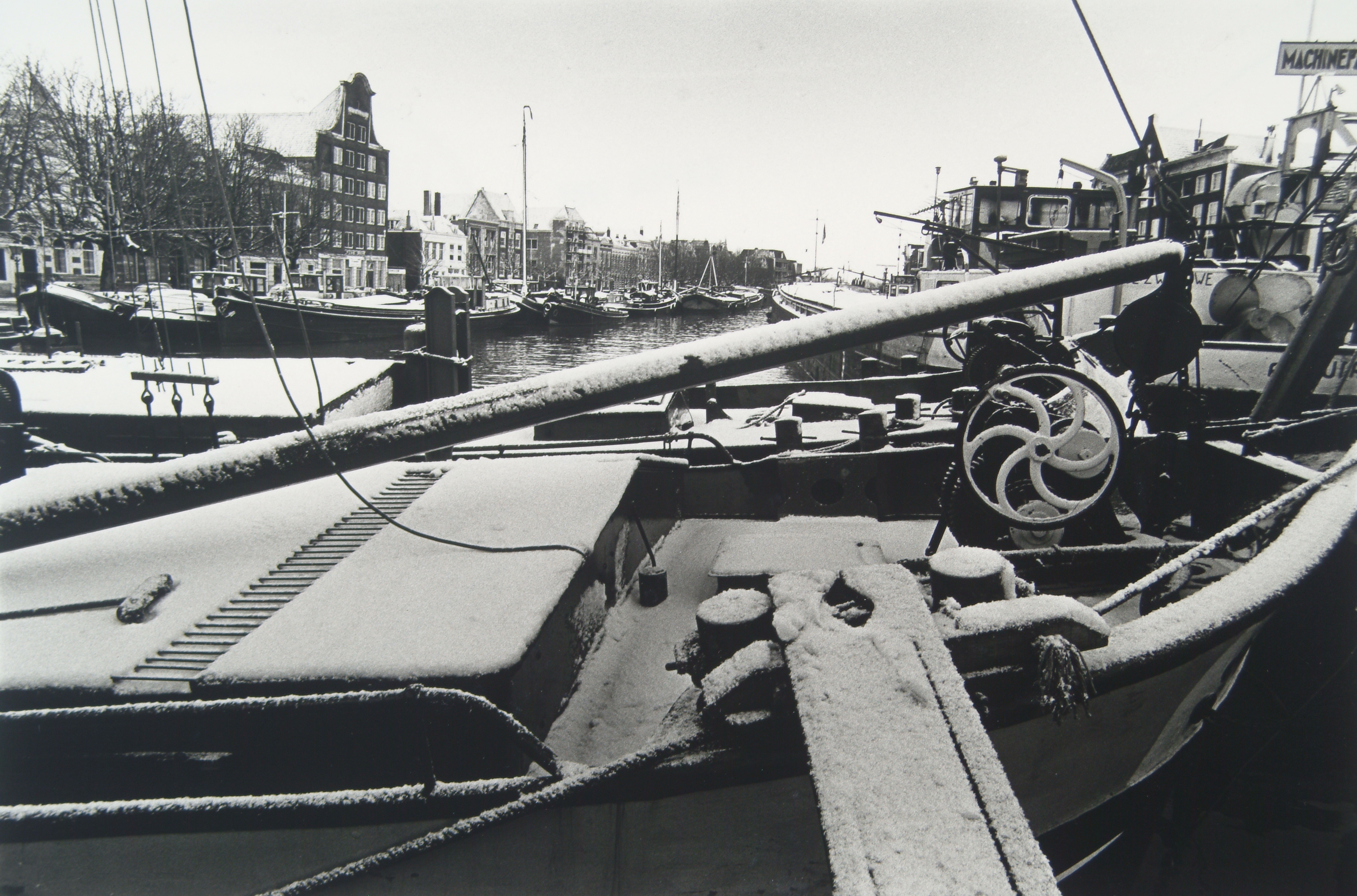 Besneeuwde binnenvaartschepen in de Wolwevershaven vanaf het Vlak