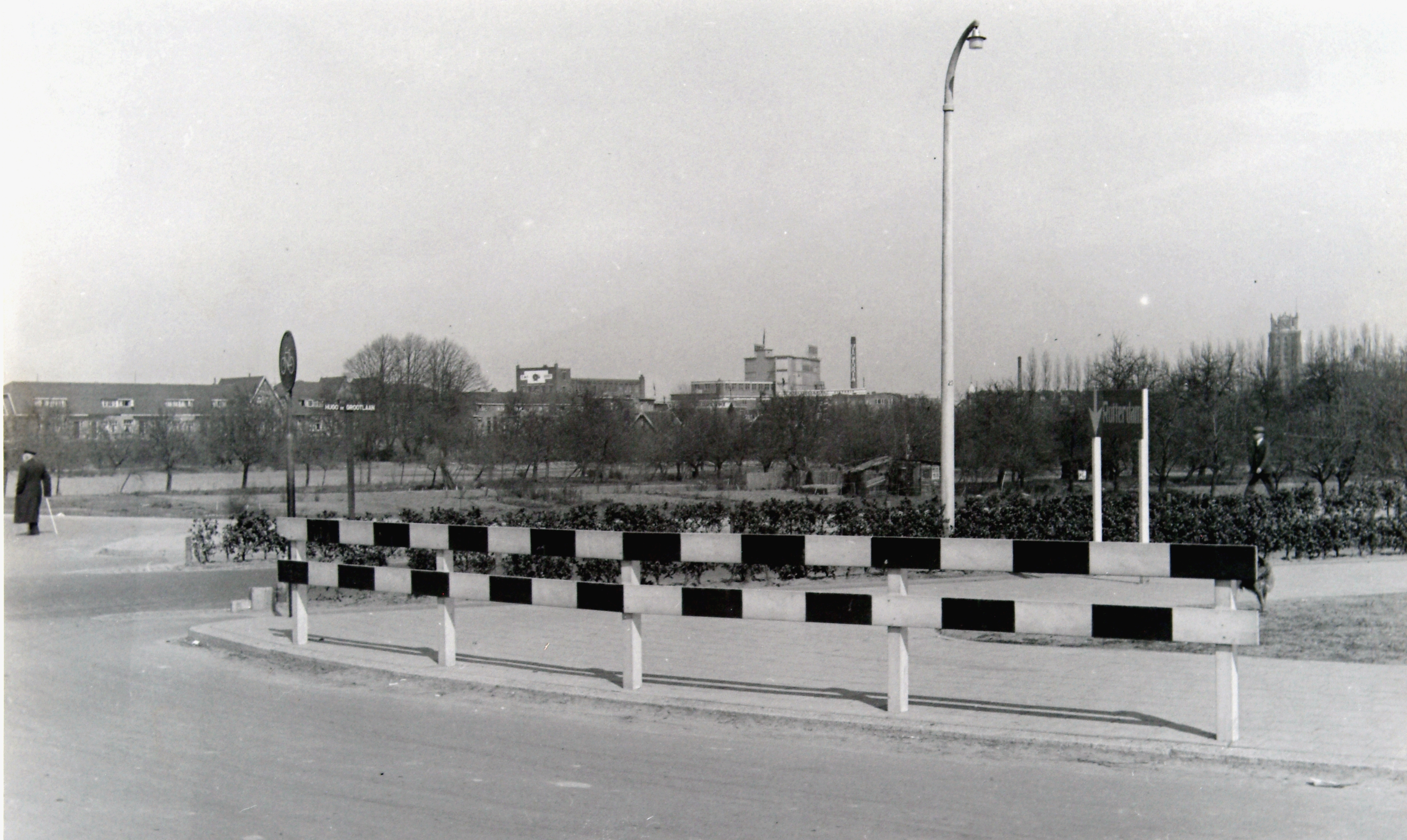 Het stuk tuinland tussen Weeskinderendijk en Hugo de Grootlaan naar het noorden gezien. Op de achtergrond in het midden de fabrieken E.M.F. en Victoria.