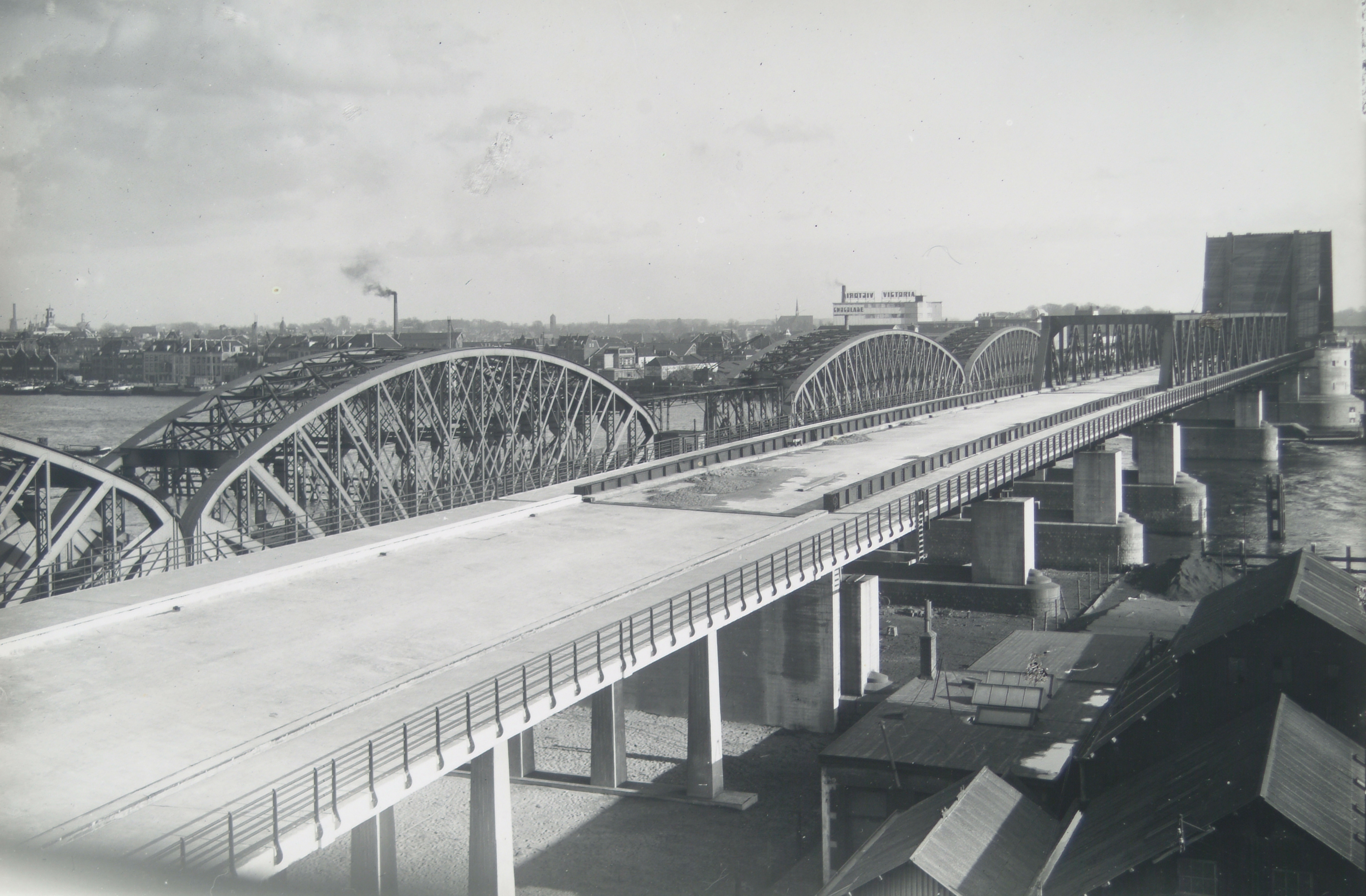 - Bouw van de Zwijndrechtse verkeersbrug over de Oude Maas. De Victoria-fabriek op de achtergrond.