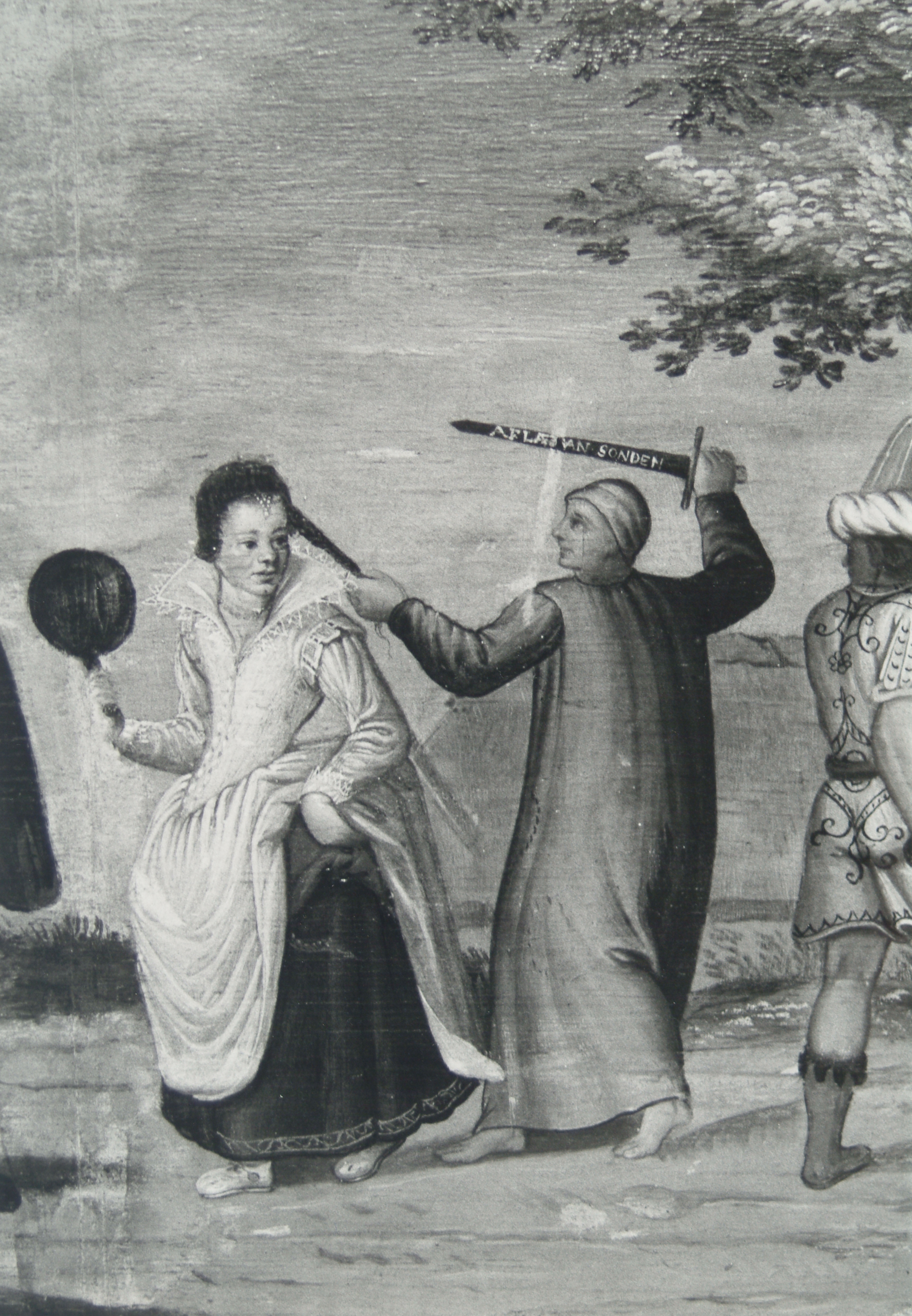 - Detailopname van het schilderij van de optocht van de rederijkerskamer De Fonteynisten, ca. 1560