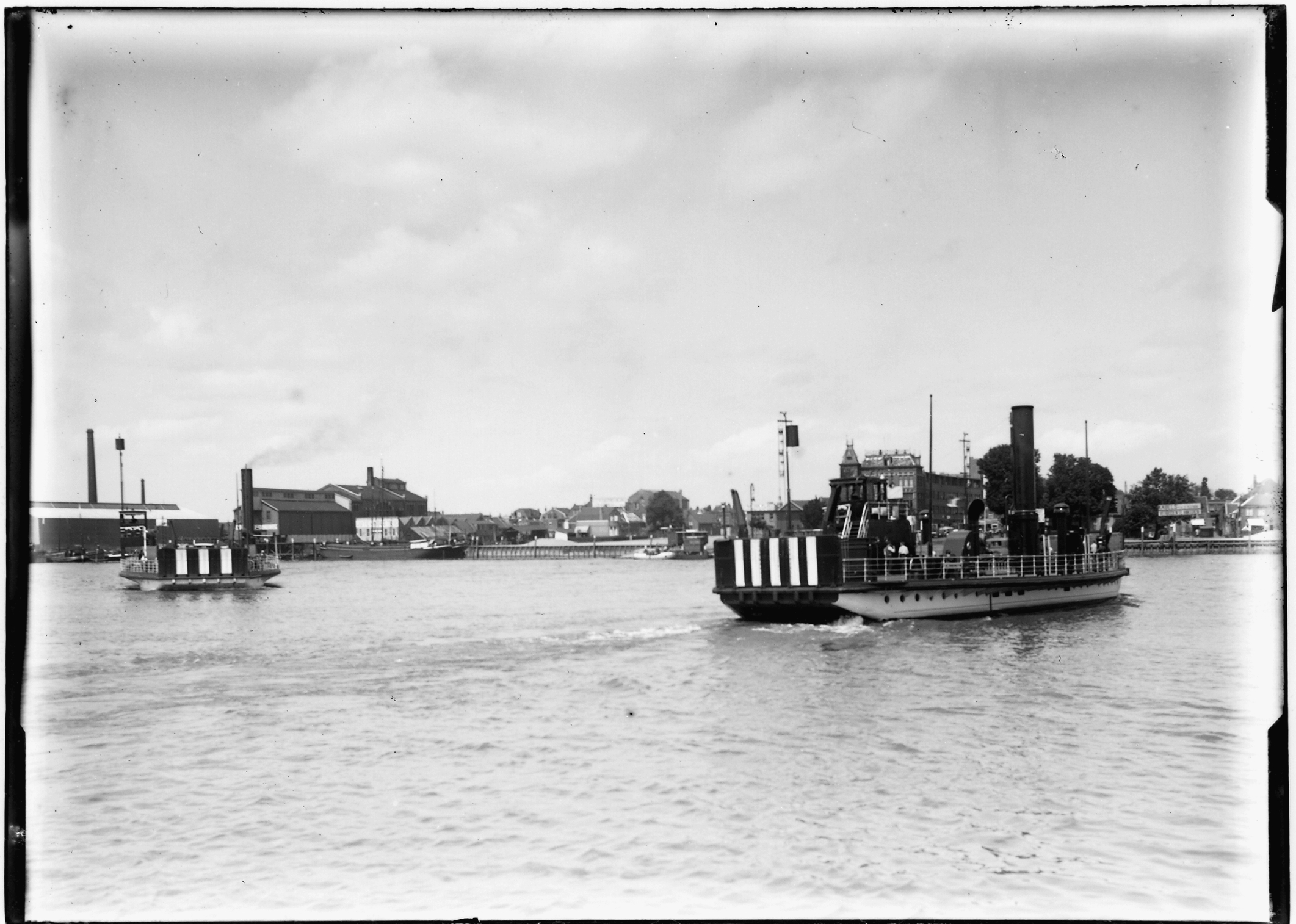- Veerboten op de Oude Maas varen tussen Dordrecht en Zwijndrecht, de Zwijndrechtse oever op de achtergrond.