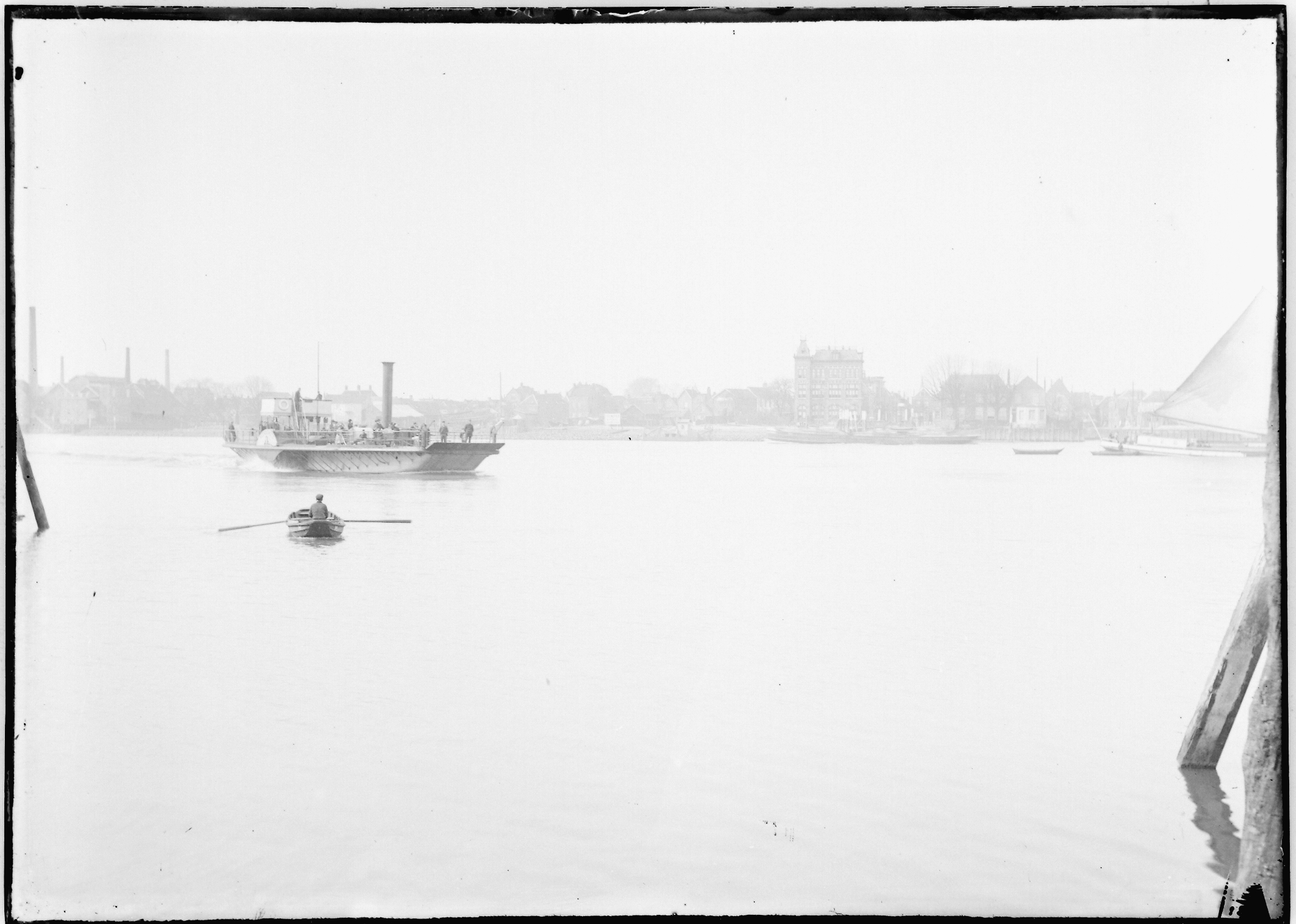 - Een veerboot op de Oude Maas vaart tussen Dordrecht en Zwijndrecht, de Zwijndrechtse oever op de achtergrond.
