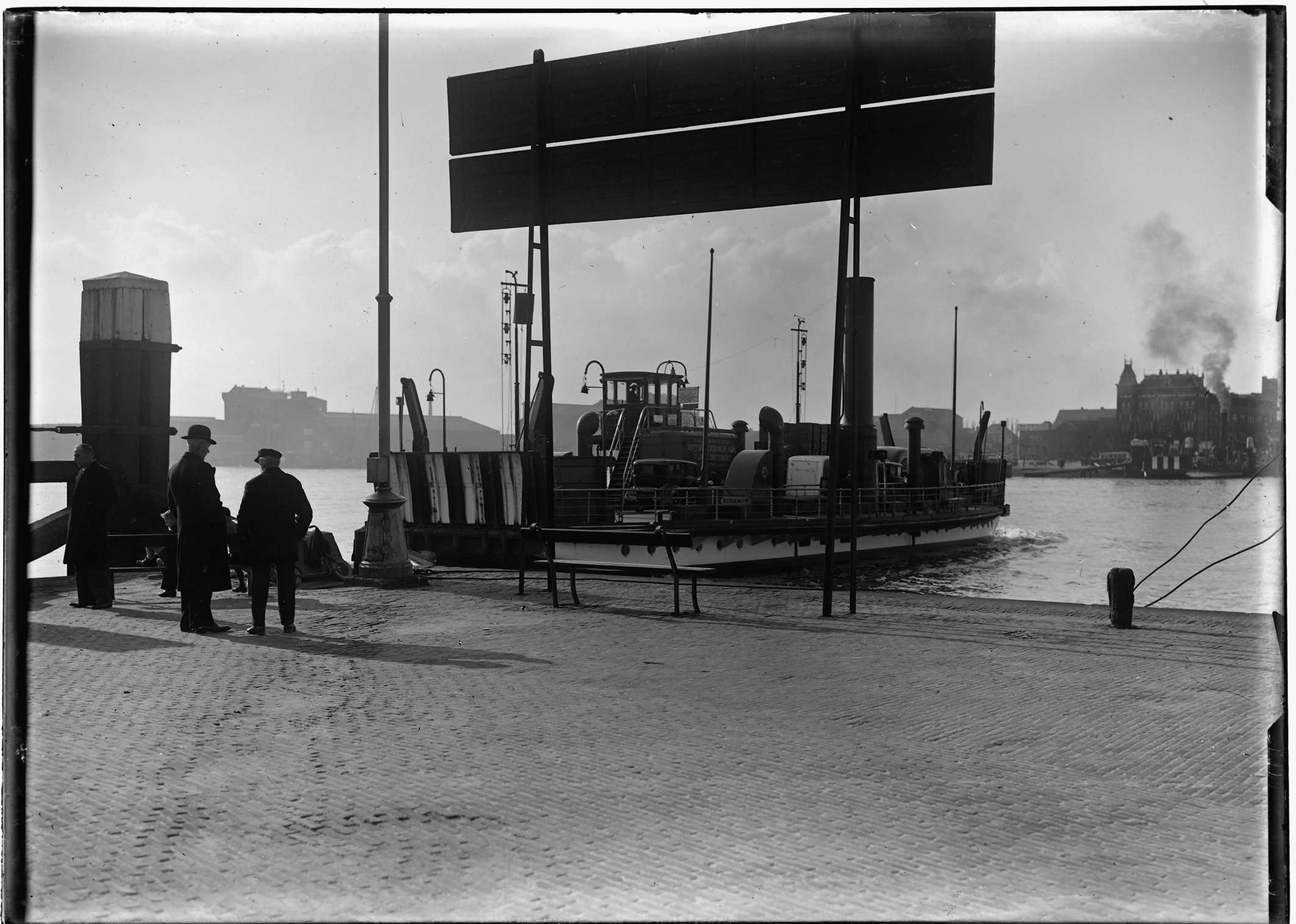 - Een veerboot vertrekt voor de overtocht over de Oude Maas naar Zwijndrecht. Van daar vertrekt ook een pont richting Dordrecht. De mannen staan op de Buiten Walevest.