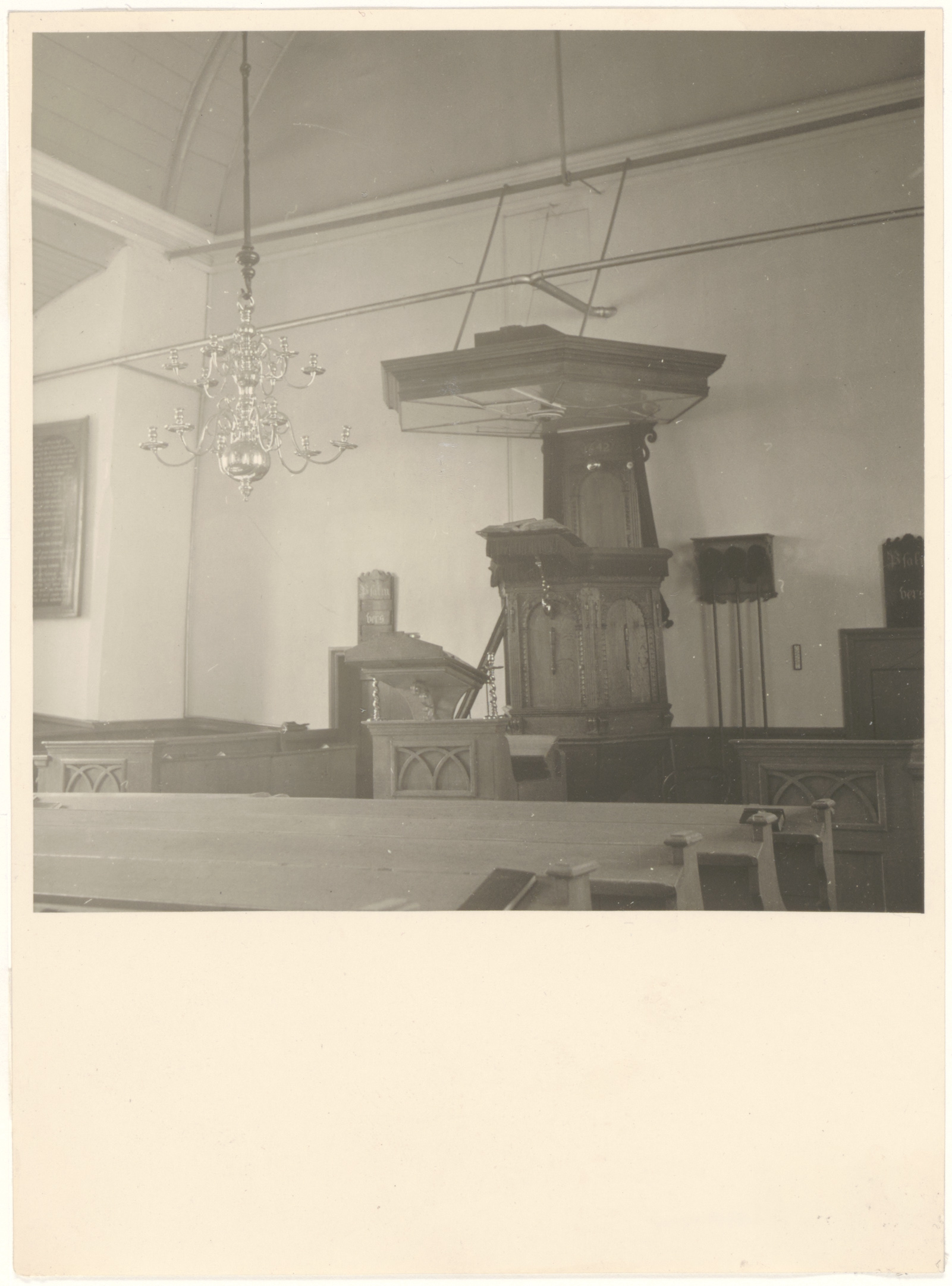 - Het interieur met o.a. koperen kronen en de kansel van de NH-kerk aan de Noordzijde te Goudriaan.