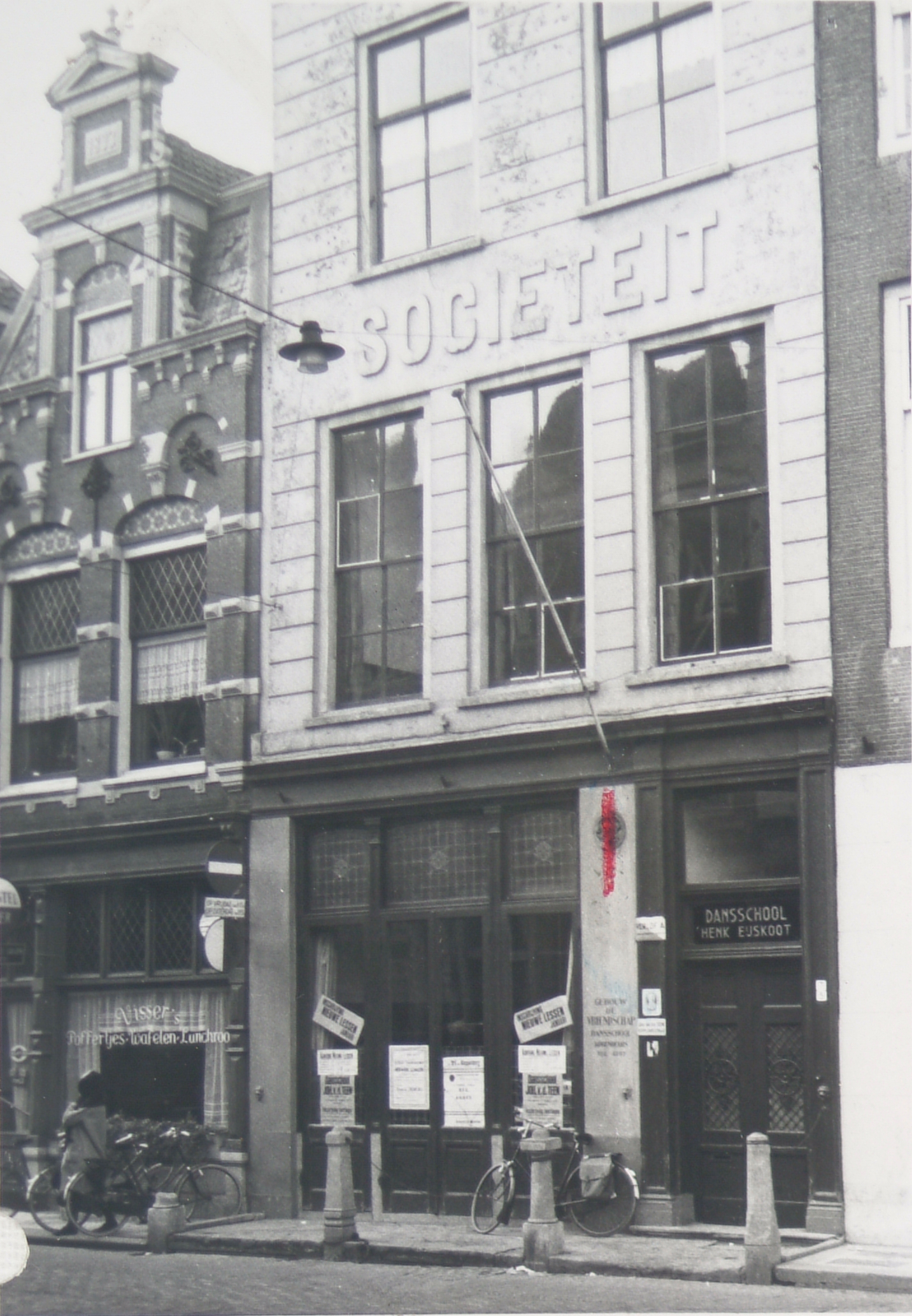 - Dansschool Eijskoot is gevestigd in het sociëteitsgebouw op de Groenmarkt. Links ernaast poffertjessalon Visser.