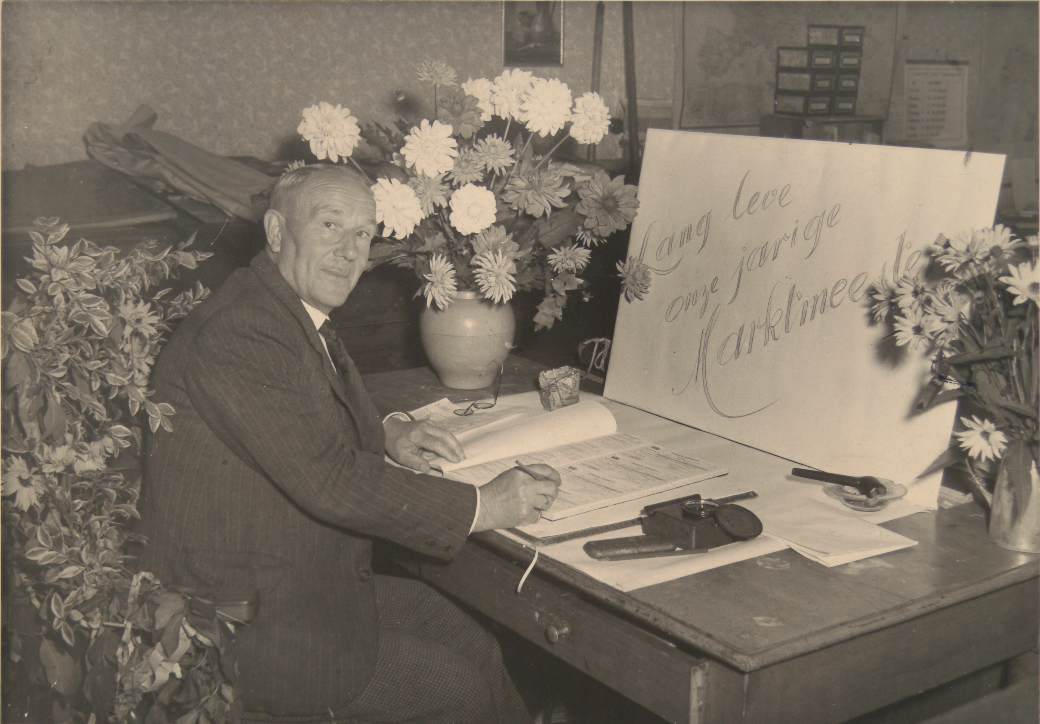 Portret marktmeester A. Zoomer bij een verjaardag
