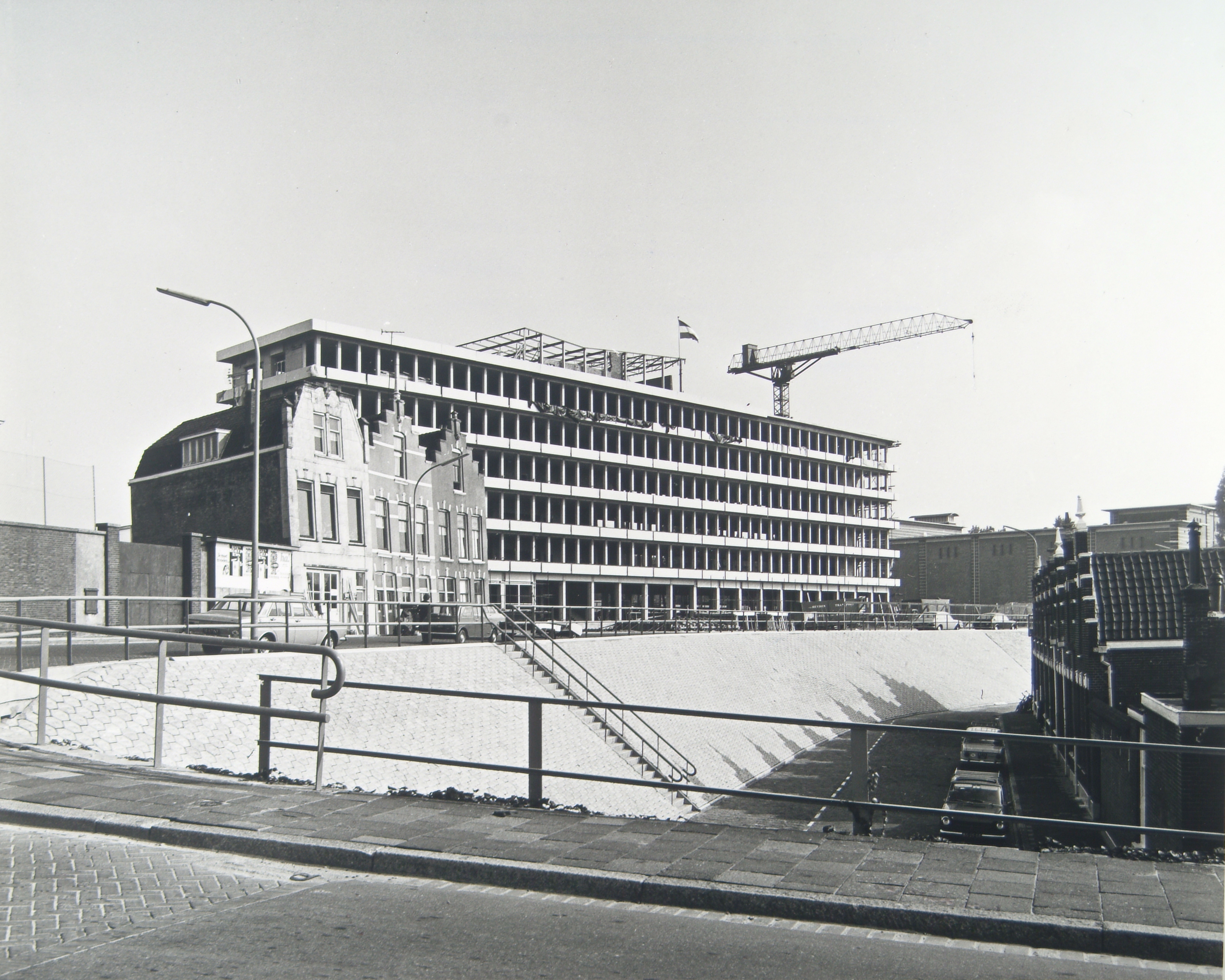 - Bouw van het kantoor van het Gemeentelijk Energiebedrijf aan de Noordendijk, gezien vanaf de Groenedijk.