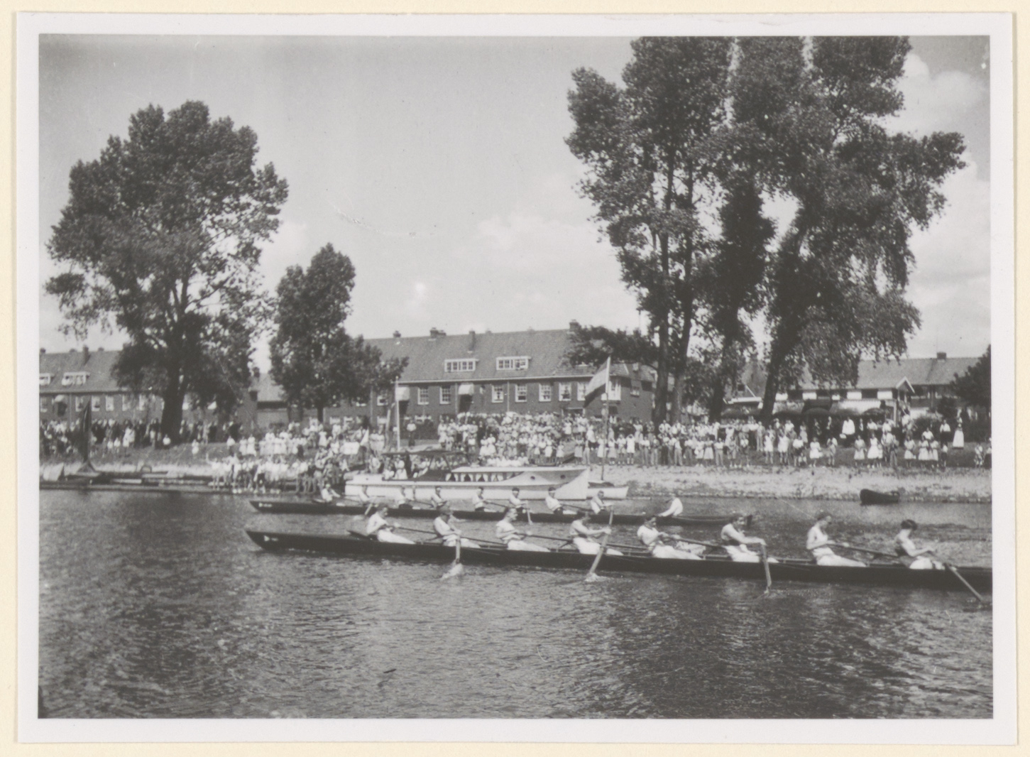 Roeiwedstrijden op het Wantij; op de achtergrond de huizen aan de Maasstraat.