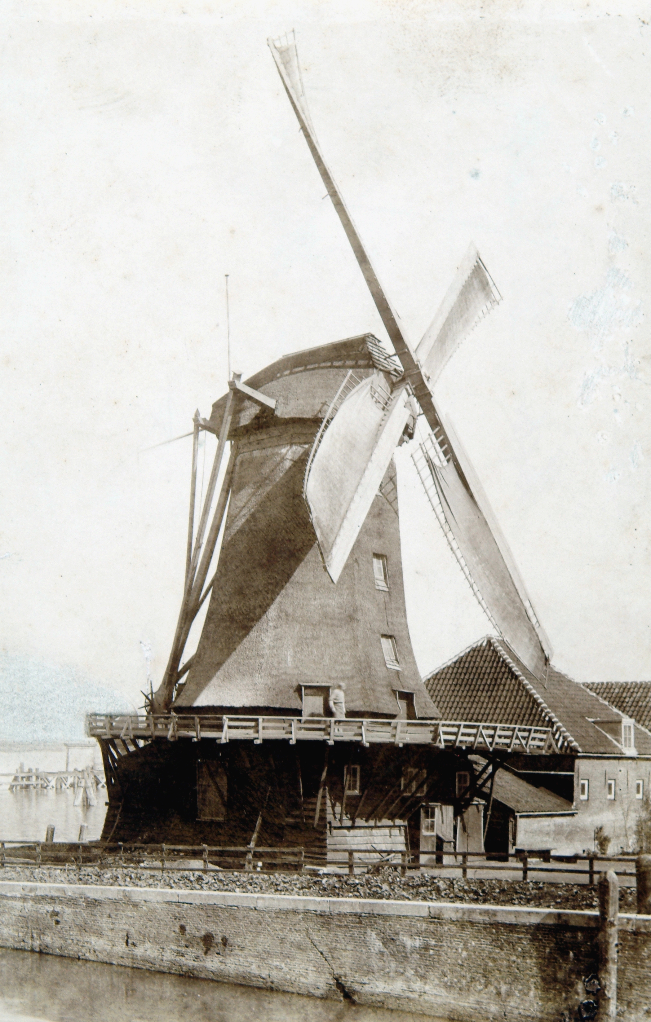 - Gezicht op molen De Zeelt in noordoostelijke richting, links is de oever bij Zwijndrecht nog zichtbaar