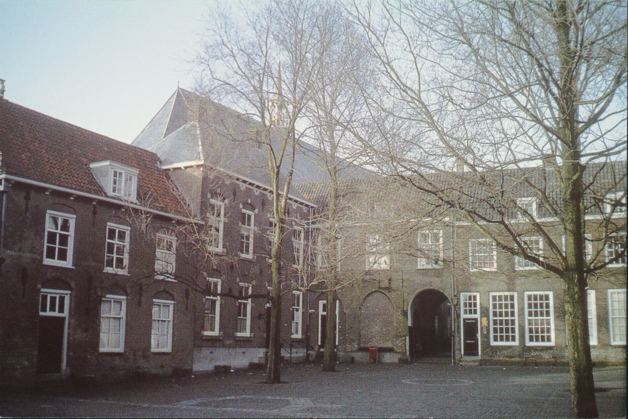 Augustijnenkerk Hervormde Gemeente Dordrecht. Hof, gezien richting Agustijnenkerk en toegangspoortje aan de Voorstraatzijde