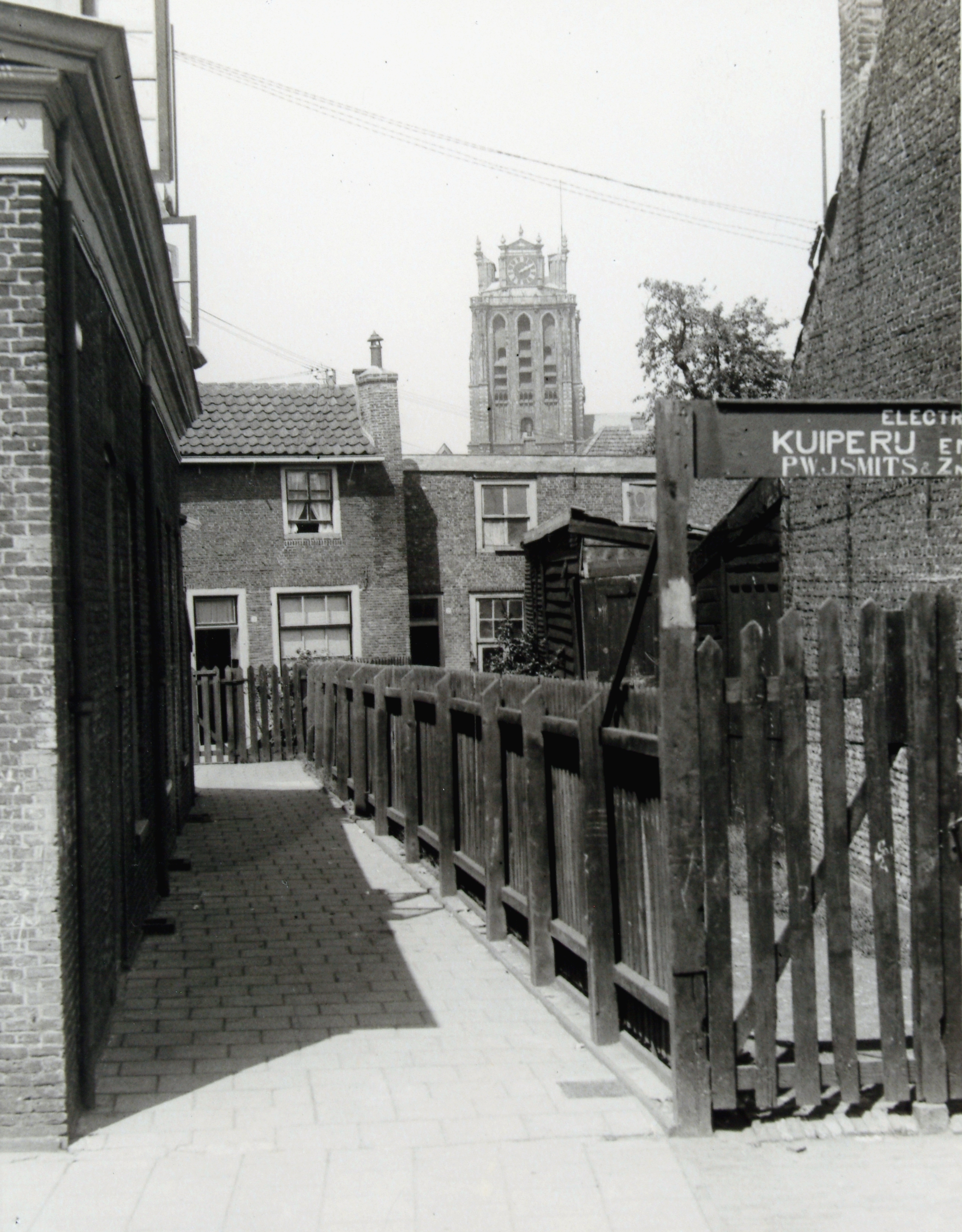 - Het Geldelozehof gezien vanaf het Geldelozepad met de Grote Kerk op de achtergrond.
