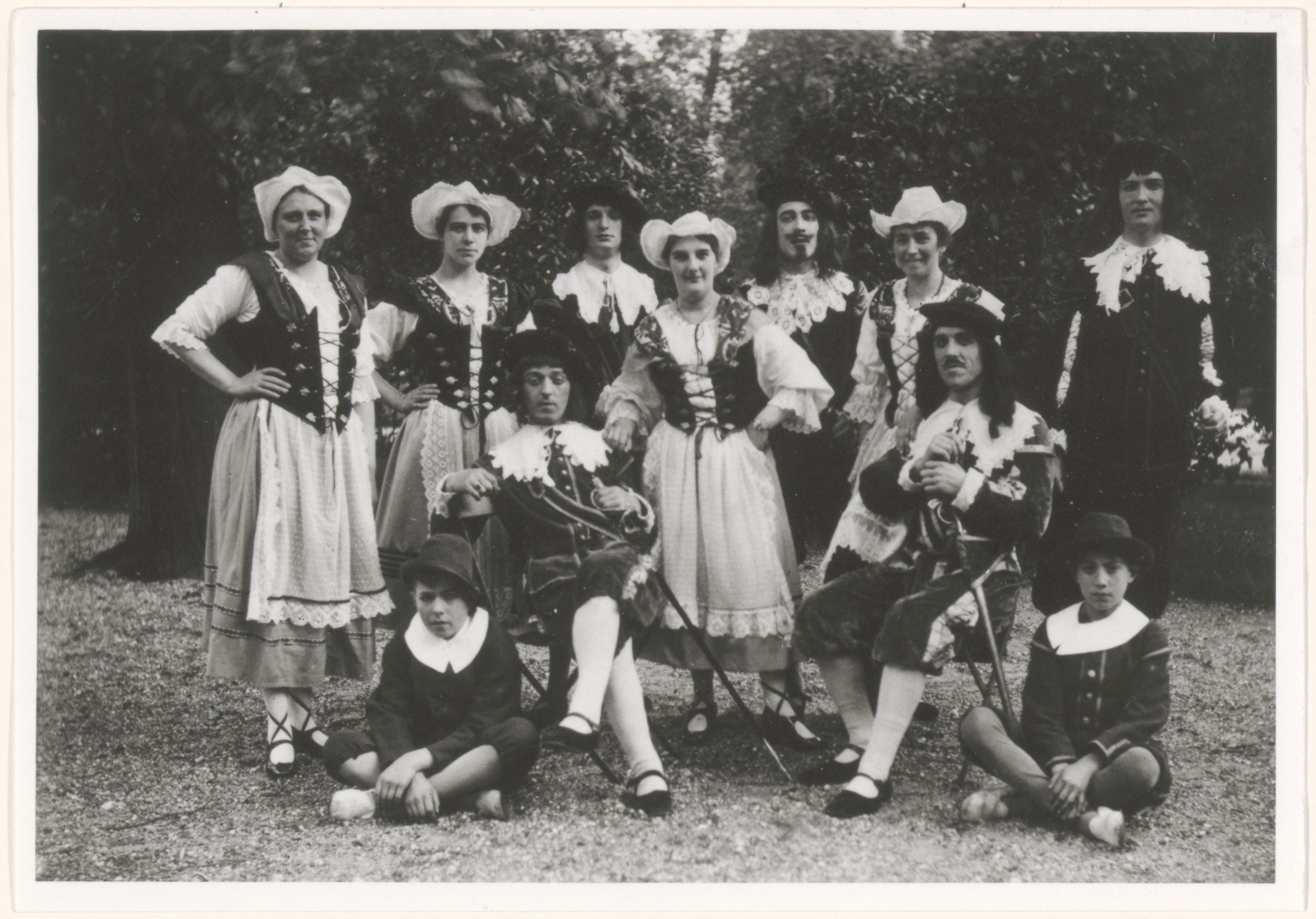 Gekostumeerde leden van de Dordtse Opera- en Operettevereniging, poserend in een tuin …