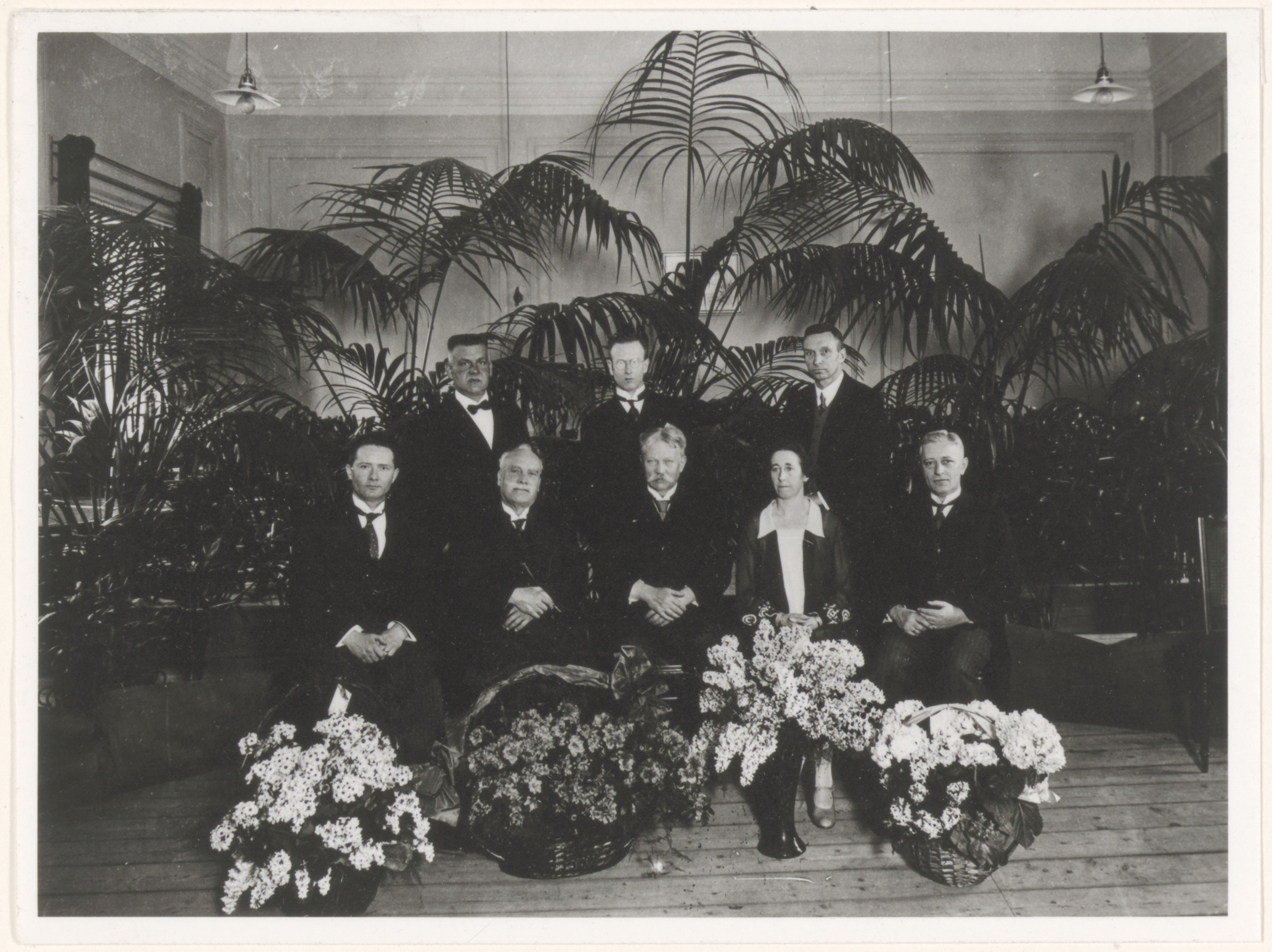 - Het bestuur van de afdeling Dordrecht van de Maatschappij tot bevordering van de Toonkunst tijdens een receptie poserend achter manden met bloemen bij het 100-jarig bestaan van Toonkunst.