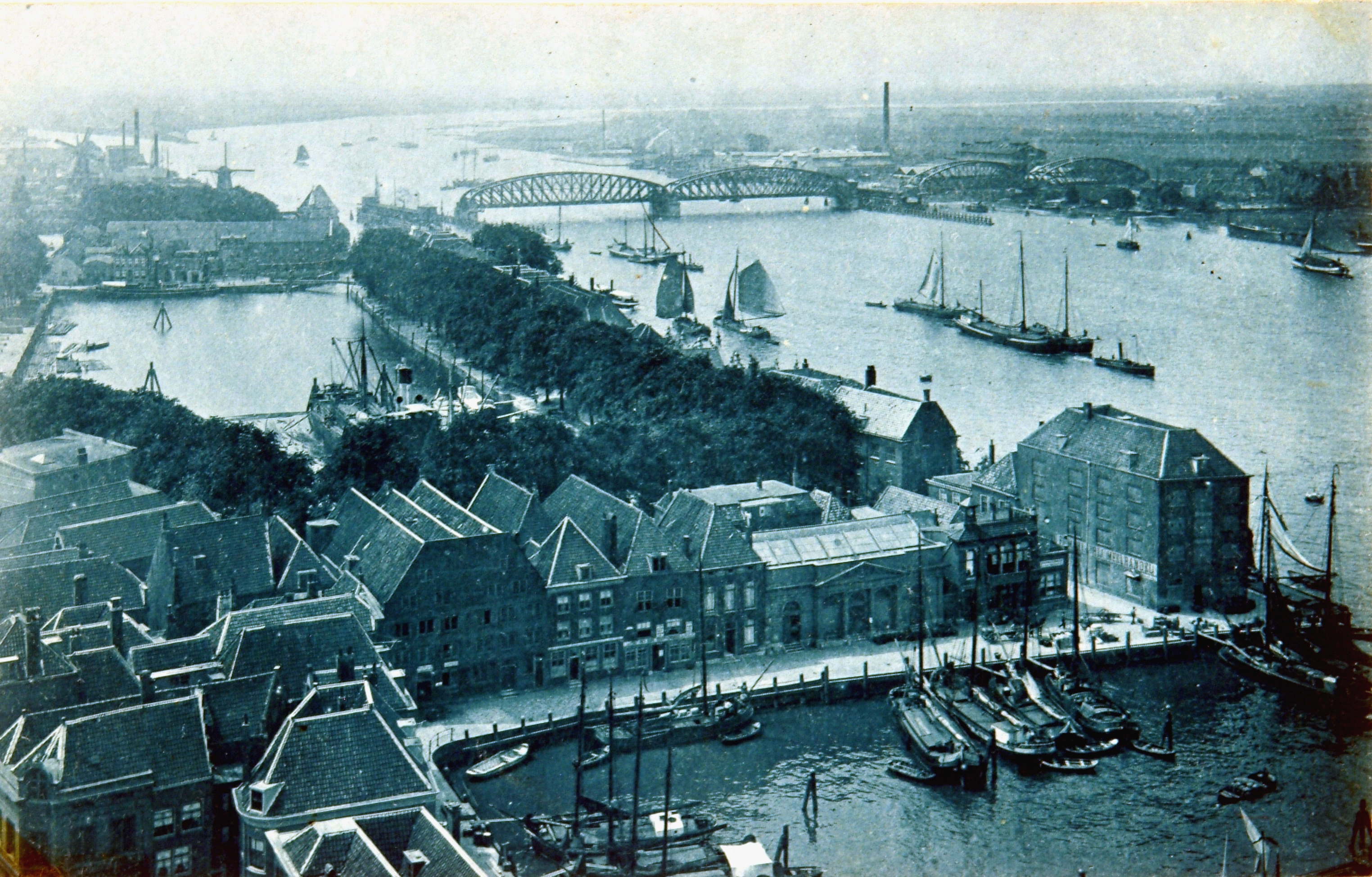 - Panorama vanaf de Grote Kerk in westelijke richting op panden rond de Kalkhaven en de Bomkade (voorgrond) en op de spoorbrug naar Zwijndrecht.
