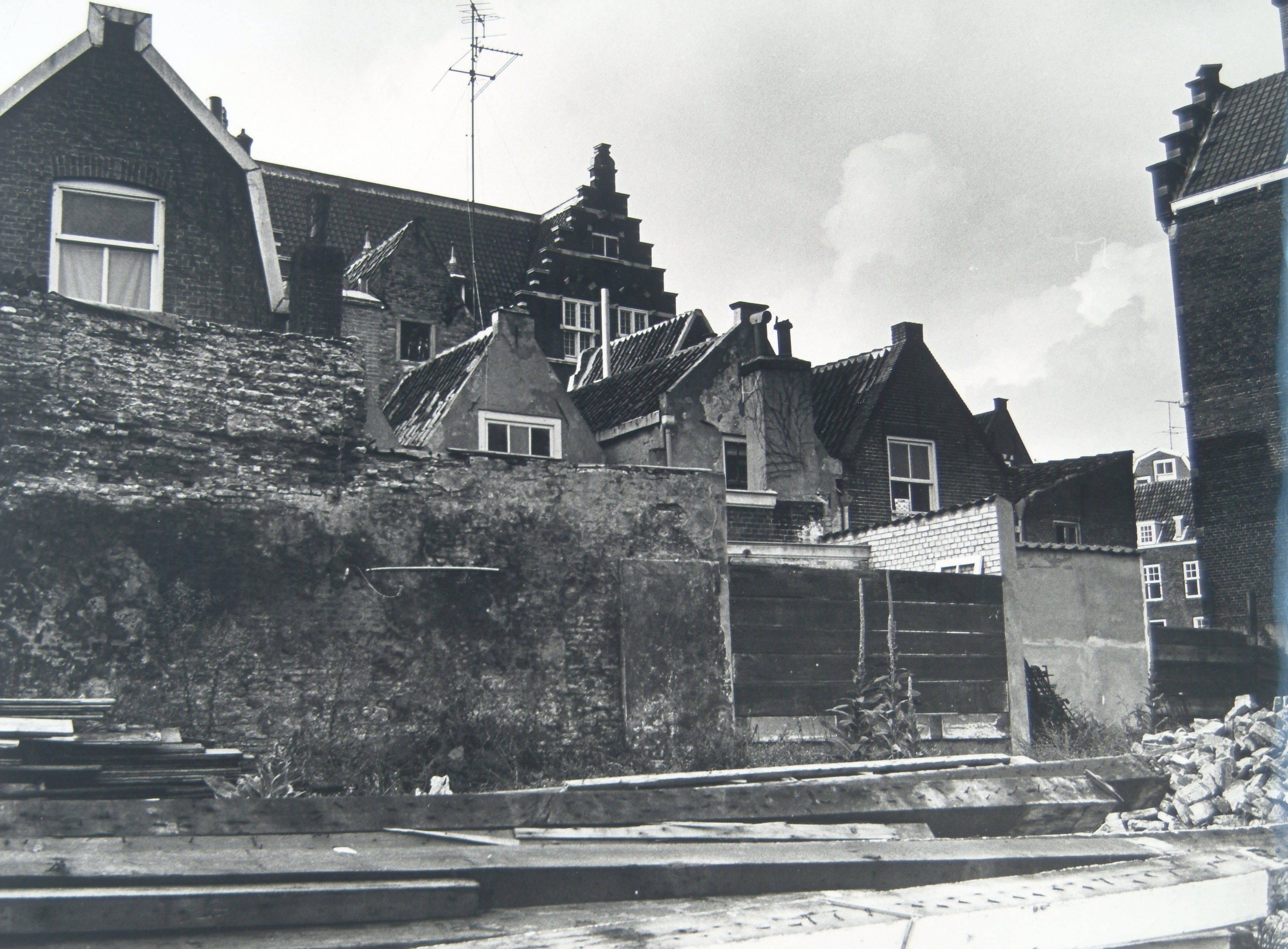 - Achterzijde van huizen aan de Hofstraat, de Statenschool op de achtergrond.