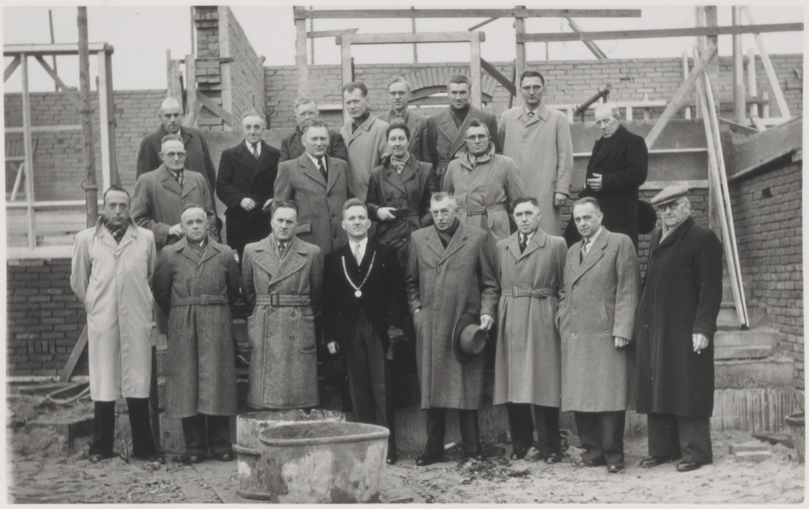 Het gemeentebestuur. V.l.n.r. 1e rij A. Mabelis, A. van Mourik (raadsleden), P. Mouthaan, H.H. de Zwart, J.C. de Haan, A. Bakker, W. den Haan en J.A. den Boon (Groene Kruis). 2e rij: J.H. Broer (raadslid), W. v.d. Laar (architect), zuster Van Duin en G. Vonk (Groene Kruis). 3e rij: A. Aantjes A.M. v.d. Heerik (Groene Kruis), N. Scheurwater (aannemers), H. v.d. Laan (opzichter), A.J. Collee M. Bouter, onbekend en Joh. Stuij (raadslid).