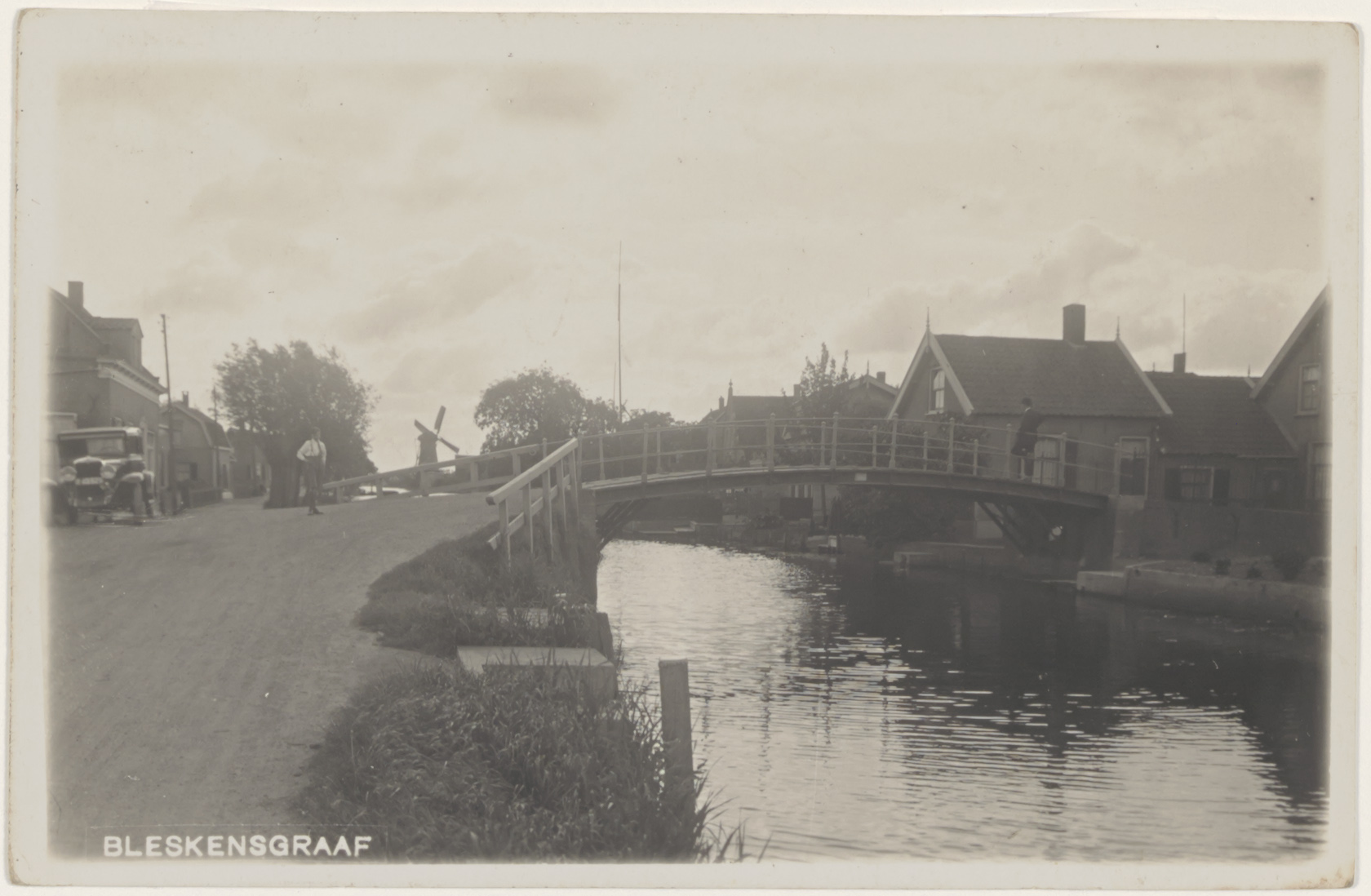 - Brug over de Graafstroom in Bleskensgraaf. Op de achtergrond de in 1890 gebouwde korenmolen van Pot. In het huisje rechts achter de brugleuning woonde Hannes de Kluiver. De vooroorlogse brug lag direct ten oosten van de nu bestaande brug.
