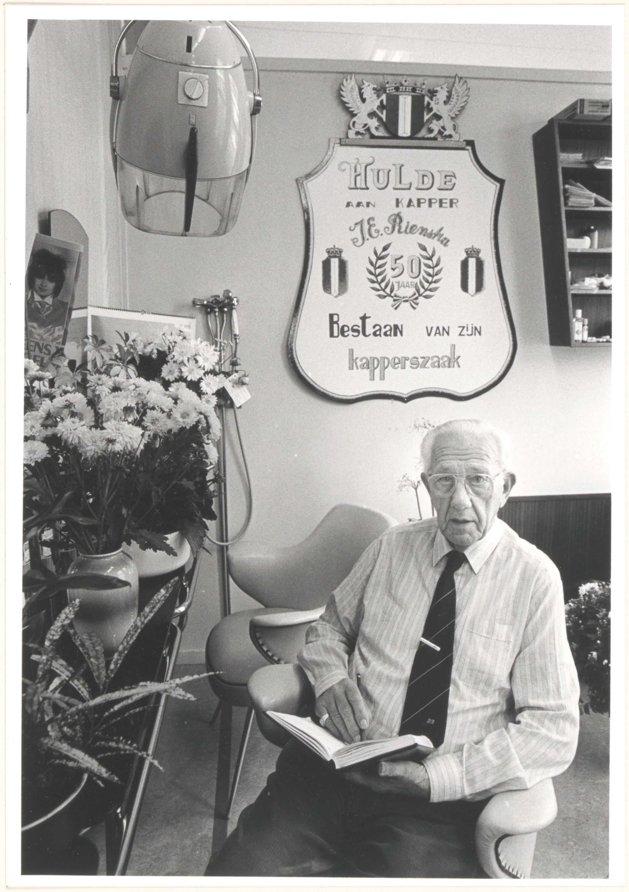 - Kapper J.E. Rienstra aan het werk in zijn kapperszaak, tijdens zijn 50-jarig bestaan van de zaak in de Bankastraat.