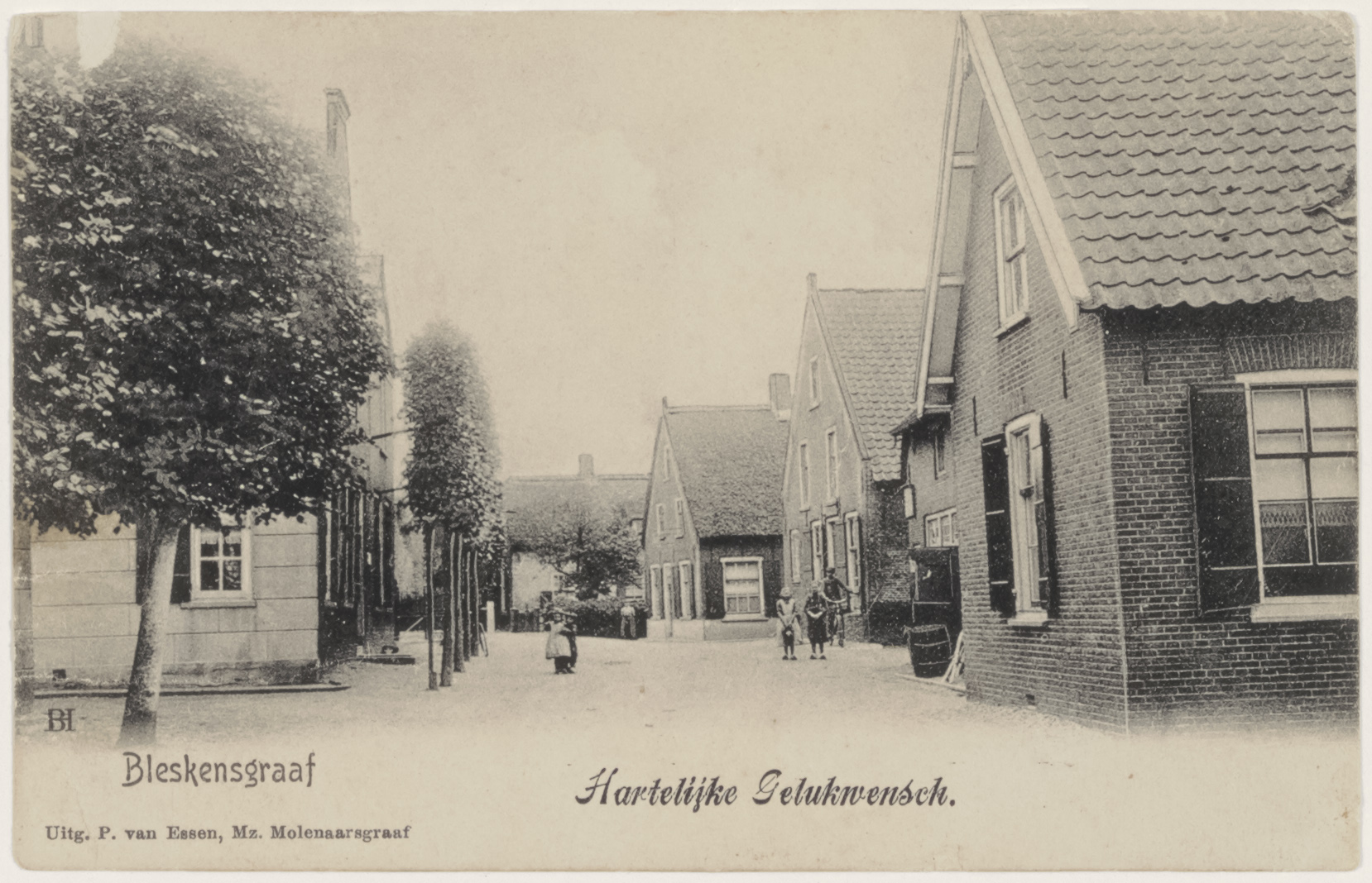 - Links achter de boom staat het huis van bovenmeester Manders. Manders had de functie van klokkenist en klokluider, zoals dat officieel heette (deze functie werd in 1937 opgeheven). De kerk en de school waren vanuit het huis binnendoor bereikbaar. Daarnaast het gemeentehuis. Op de achtergrond de boerderij van de familie Verlek. In het pand ervoor was een café, daarnaast kruidenier Gart Lakerveld, dan de bruggang met daaraan grenzend de smederij van Harm van der Horst en vooraan kruidenier Smit.