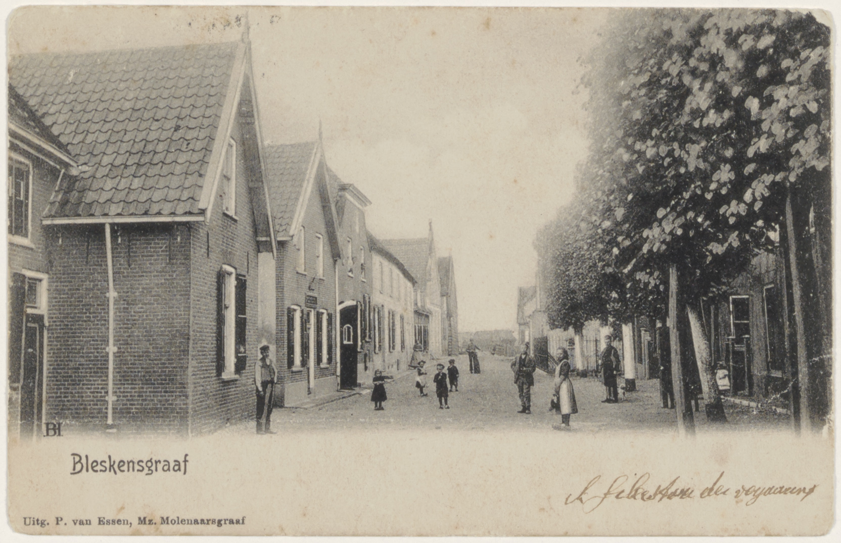 - De Kerkstraat in Bleskengraaf, gezien naar het westen. Links smederij Van Der Horst, vervolgens de kruidenierswinkel van Smit en daarnaast kruidenier Wim van Rees. Tenslotte de bakkerij van Kees Vrome, die later door de familie Baan zou worden overgenomen. Het jongetje met het zwarte petje, 5e van links, is Pauw van Rees; hij zou later de zaak van zijn vader overnemen.