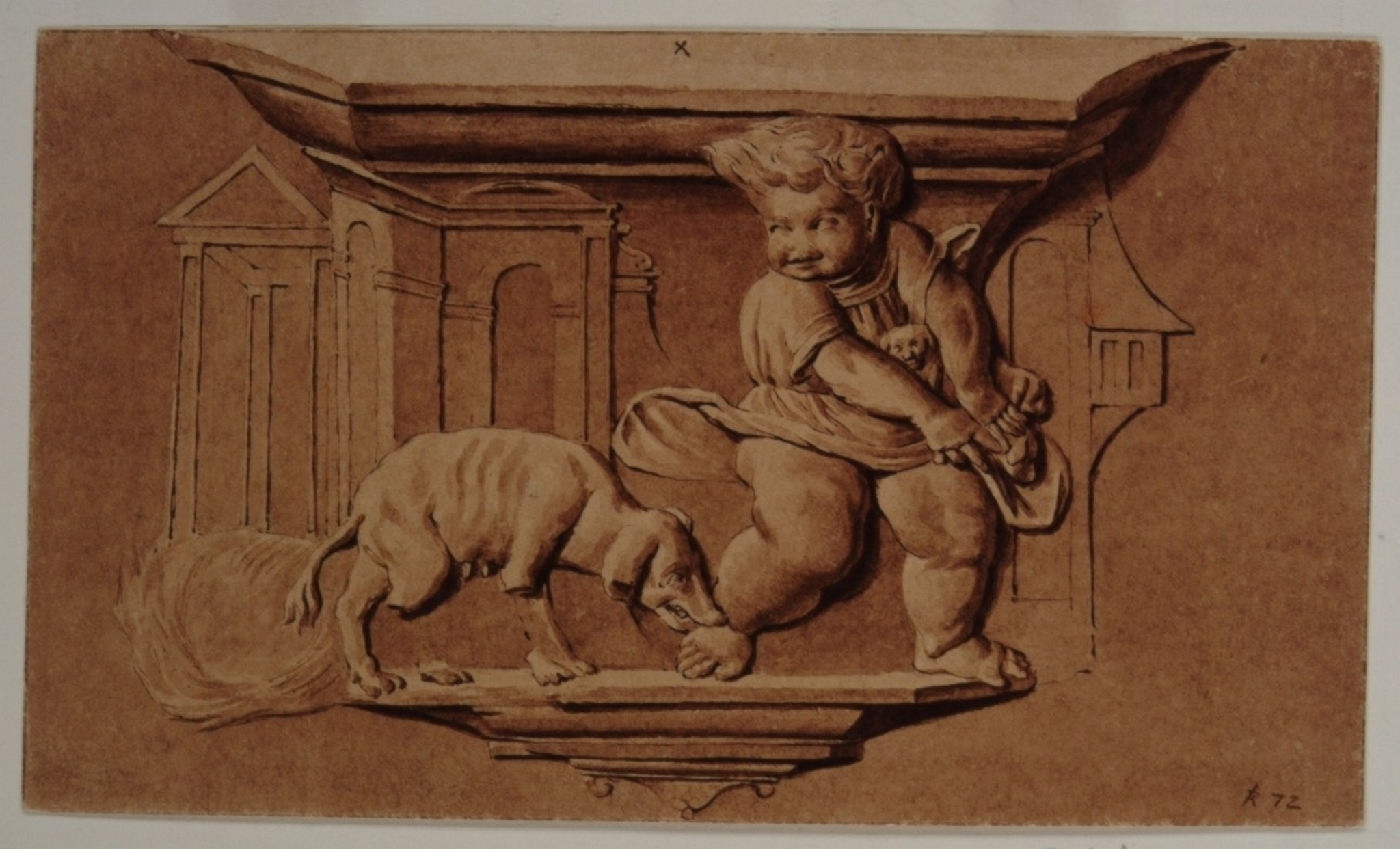 Misericorde onder een koorstoelzitting in de Grote Kerk voorstellende een hond die een kind bijt dat zich met een puppie uit de voeten maakt