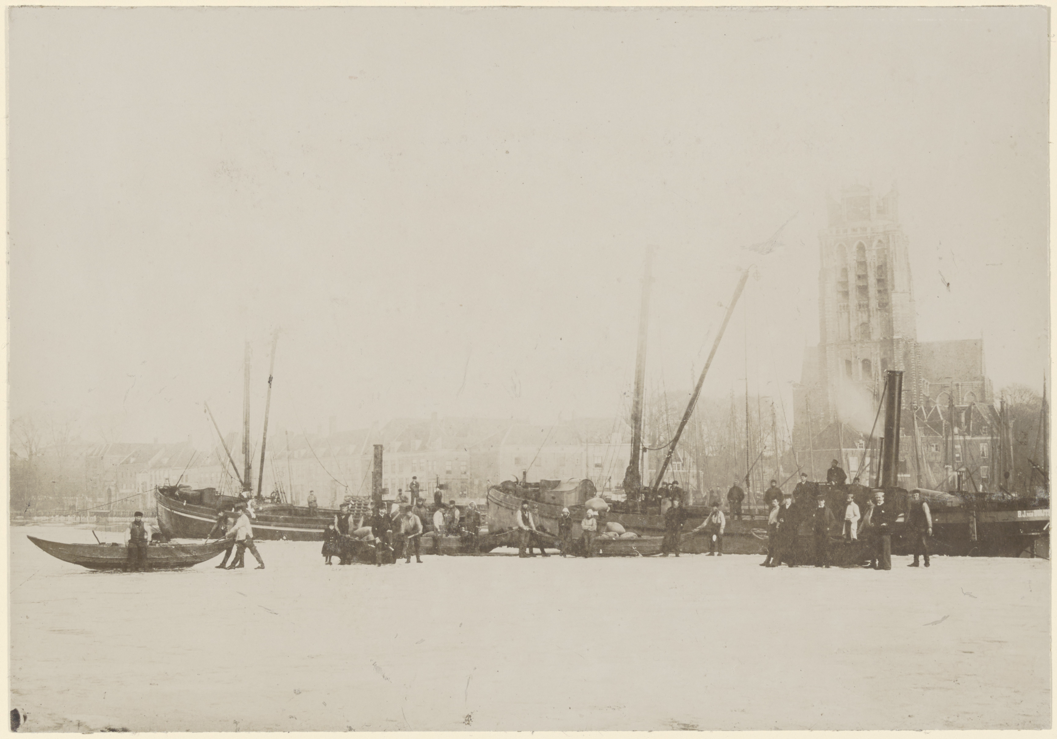 - De in de winter van 1880 dichtgevroren Oude Maas ter hoogte van de Bomkade en de Grote Kerk.