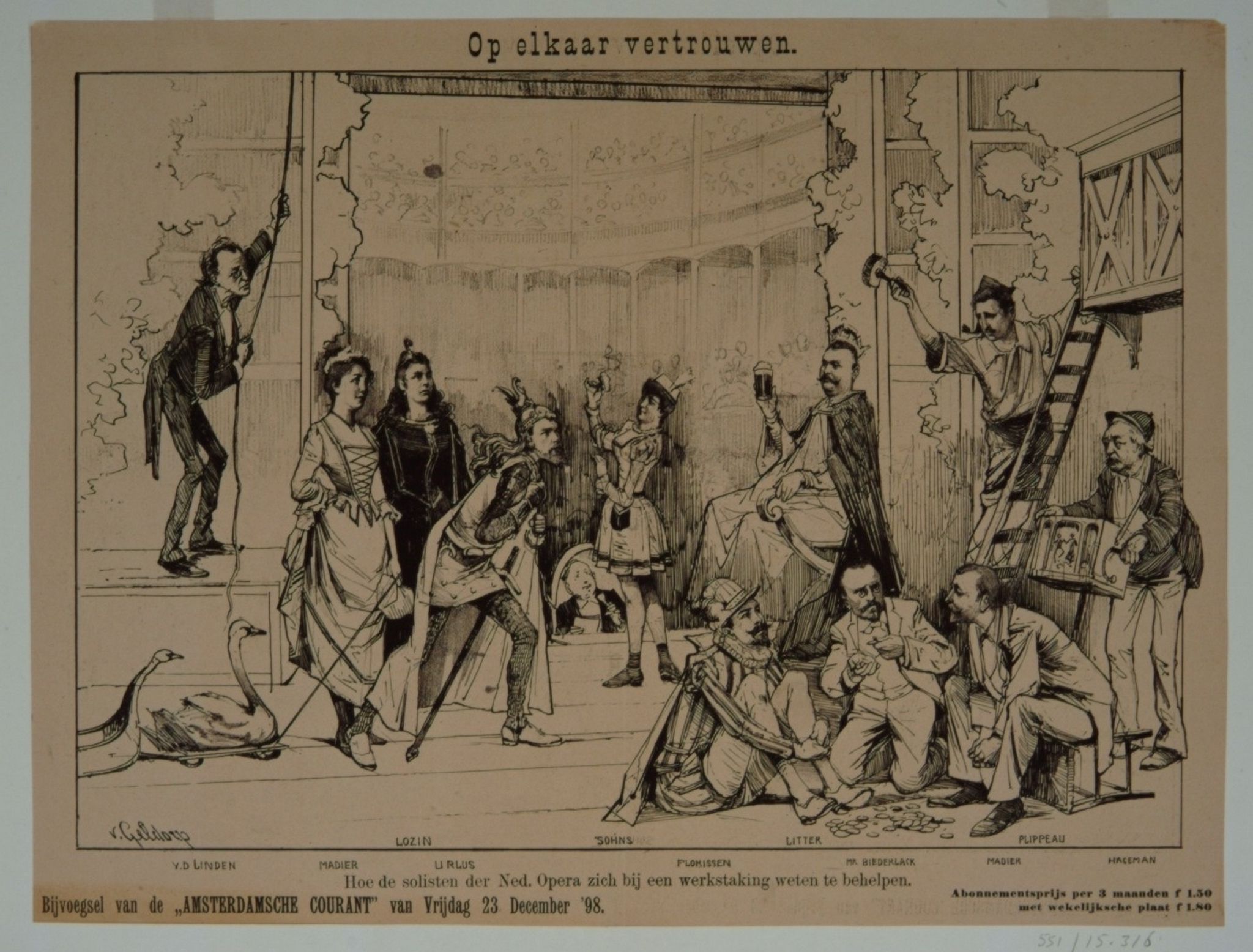 - Spotprent met als opschrift 'Op elkaar vertrouwen' over hoe de solisten van de Nederlandsche Opera te Amsterdam zich bij een werkstaking weten te behelpen; met o.a. Urlus als Lohengrin, Hageman als orgeldraaier en directeur C. van der Linden die het doek ophaalt.